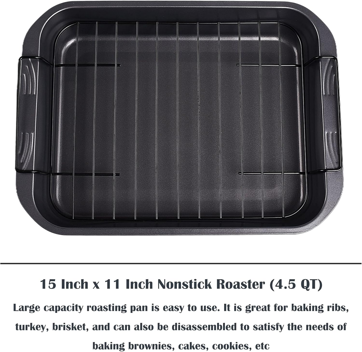 kitCom Bakeware Nonstick Roaster, Nonstick Roasting Pan with Rack, Great For Roast Chicken, Roasts And Turkeys - 15 Inch x 11 Inch (5.8 QT), Gray