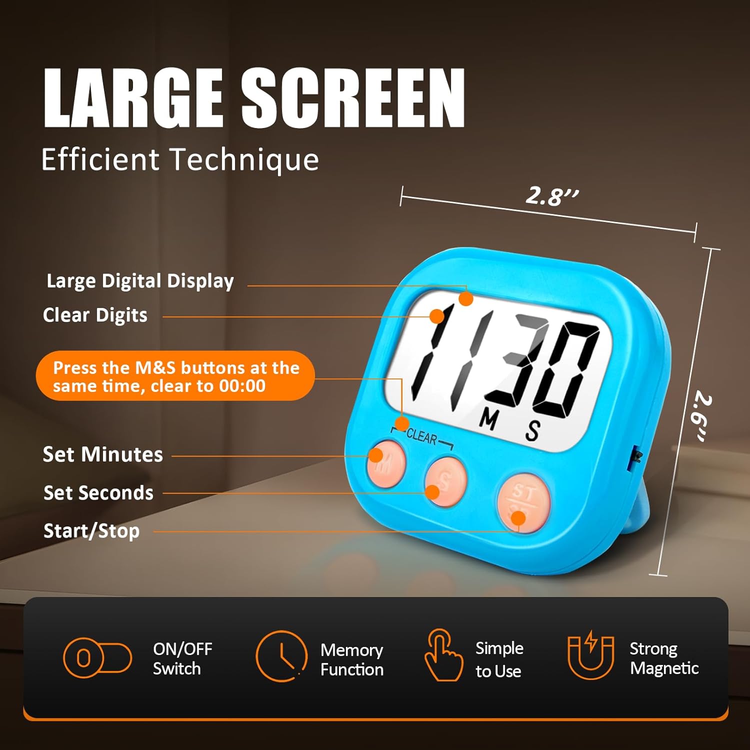 - 6 pack digital kitchen timers with large display and 3 buttones, super easy to read and set up.