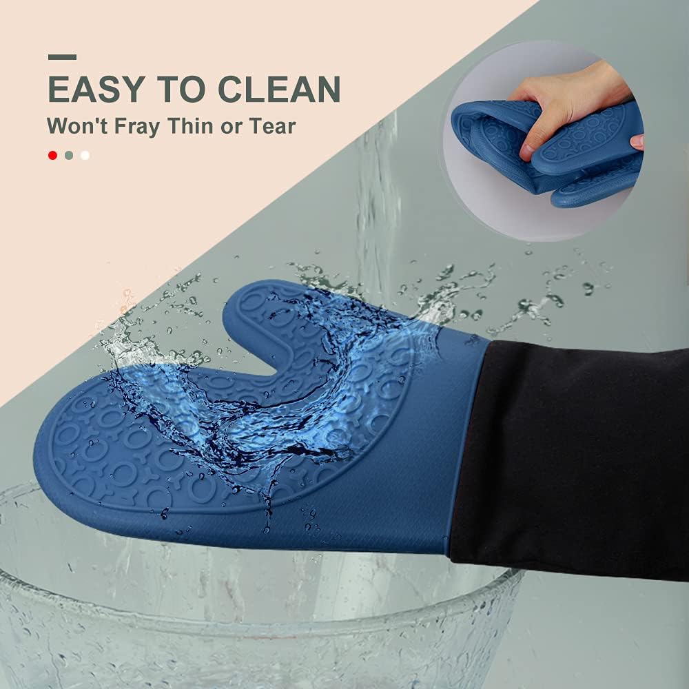- Easy to Clean & Waterproof: The oven mitts are easy to clean. If you get any food on them while wearing, just gently swish around in soapy water or just wipe them clean. You can hang it up with the nice hanging hook in the cuffs. The silicone part is totally waterproof.