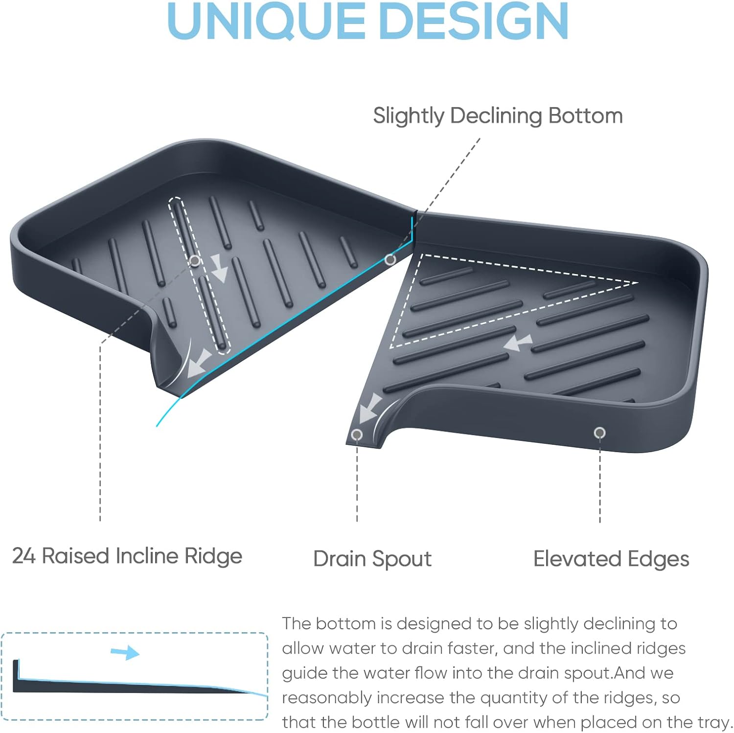 - 【Thoughtful and Unique Design】 Unique self-draining design, the bottom of the soap tray for kitchen sink is designed to be slightly declining to allow water to drain faster, the inclined ridges guide the water flow into the drain spout. And we reasonably increase the quantity of the ridges, so that the bottle will not fall over when placed on this kitchen sink storage tray organizer. All these unique features are specially designed after many tests.