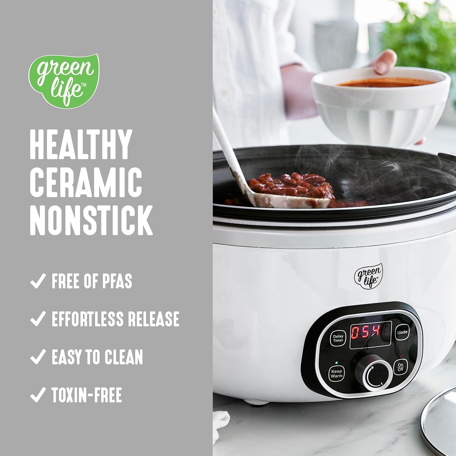 GreenLife 6QT Slow Cooker, Non-Toxic PFAS-Free Ceramic Nonstick Removable Interior Bowl, Programmable, Family Friendly, Keep Warm, Stovetop & Oven Safe, Dishwasher Safe Parts, Timer, Glass Lid, White