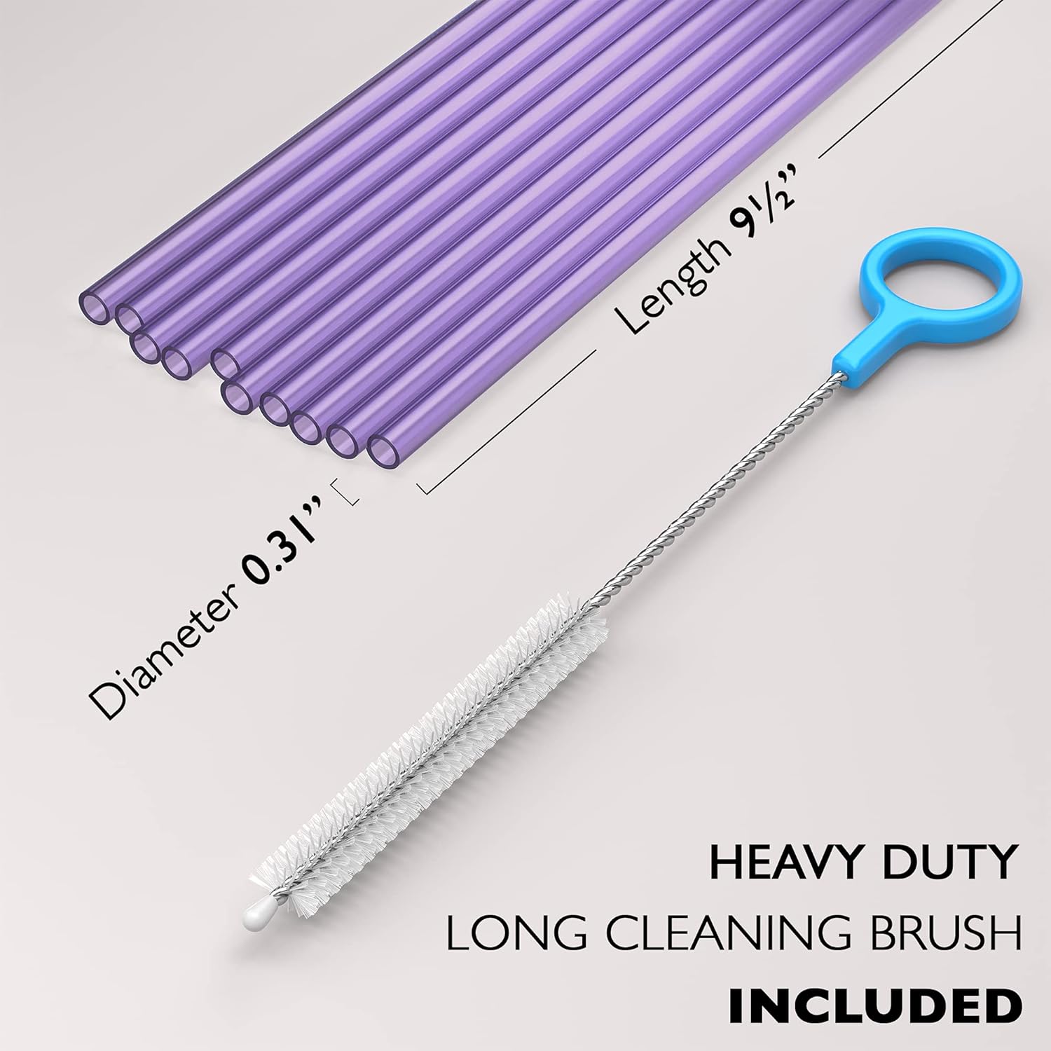 10 Long Reusable Hard Purple Plastic Drinking Straws, Medium Width + Sturdy Cleaning Brush - for Tumblers, Mason Jars, Smoothies and Milkshakes - Dishwasher Safe BPA Free