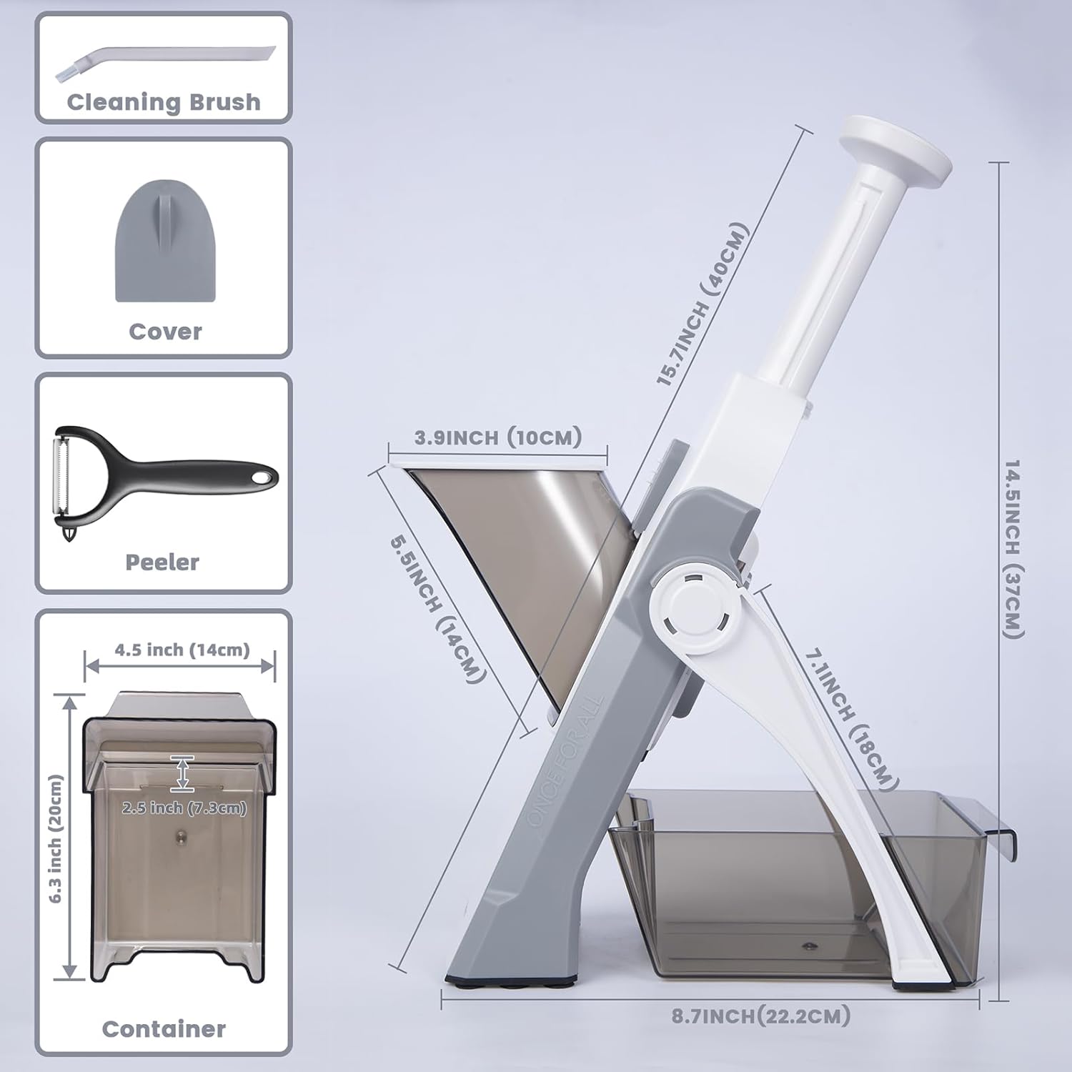 - UPGRADE SAFE SLICER: Safety mandoline slicer for any cook. Sharp hidden blade Slicing is fast, uniform, and easy to set up and clean up, and does not need to glove up or change the blade to use it, This is definitely an upgrade your cooking daily.