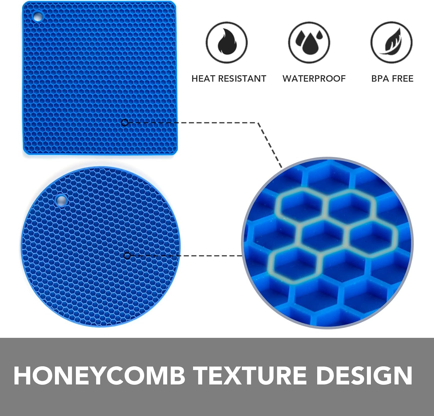 - HONEYCOMB DESIGN: Our innovative honeycomb pattern silicone trivets create a multipurpose surface that protects countertops from heat or water damage.
