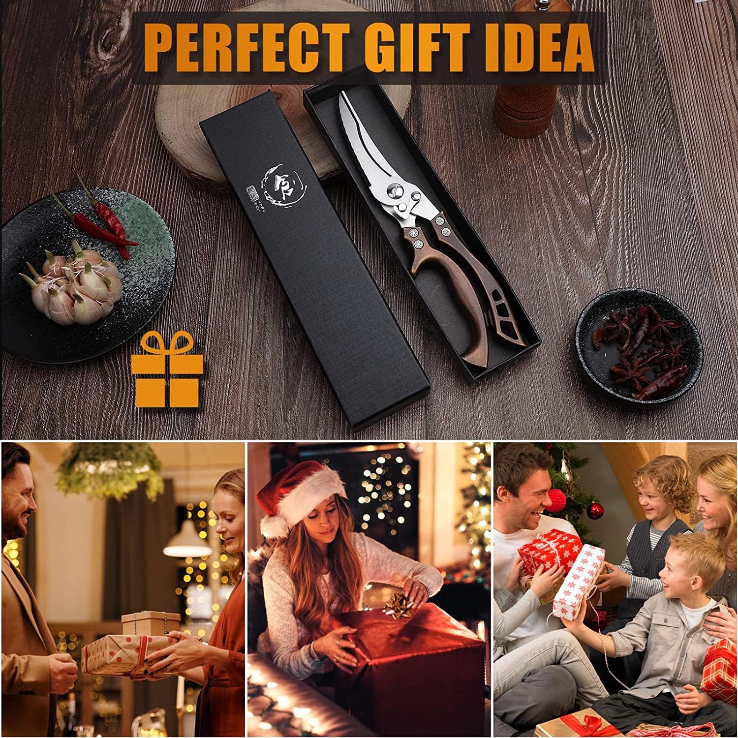 - 【COMFORTABLE ERGONOMIC SEAHORSE ARC DESIGN HANDLE】The ergonomic handles of the kitchen shears crafted by first-grade brass, which makes it anti-slip and offer you a comfortable grip. And the poultry shears heavy duty handle with great grip is suitable for both left and right hands users. The seahorse arc design will protect your hand from injury when you cut food ingredients. Also reinforced rivets embedded in the handle deeply, which makes it be solid and firm.