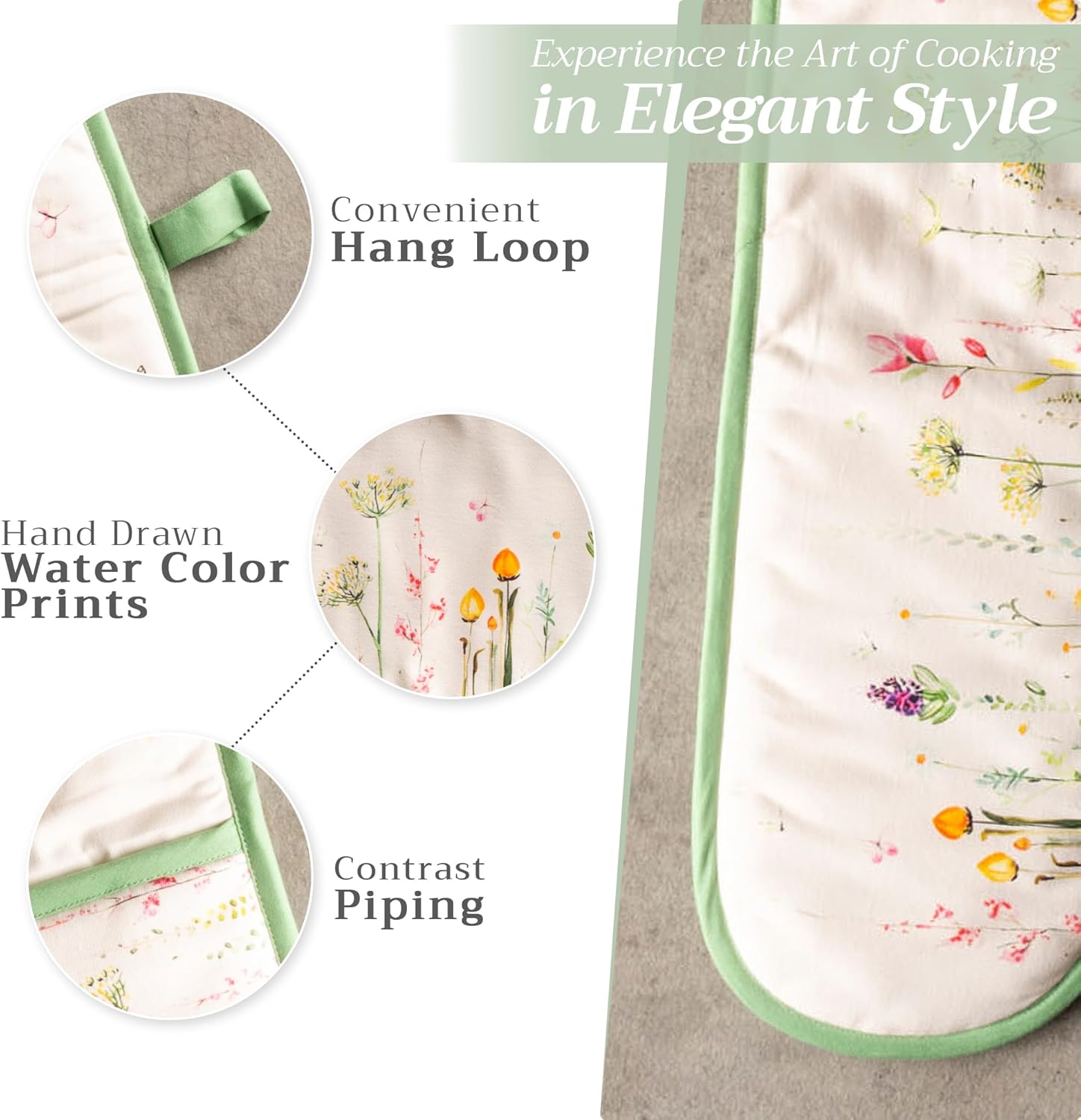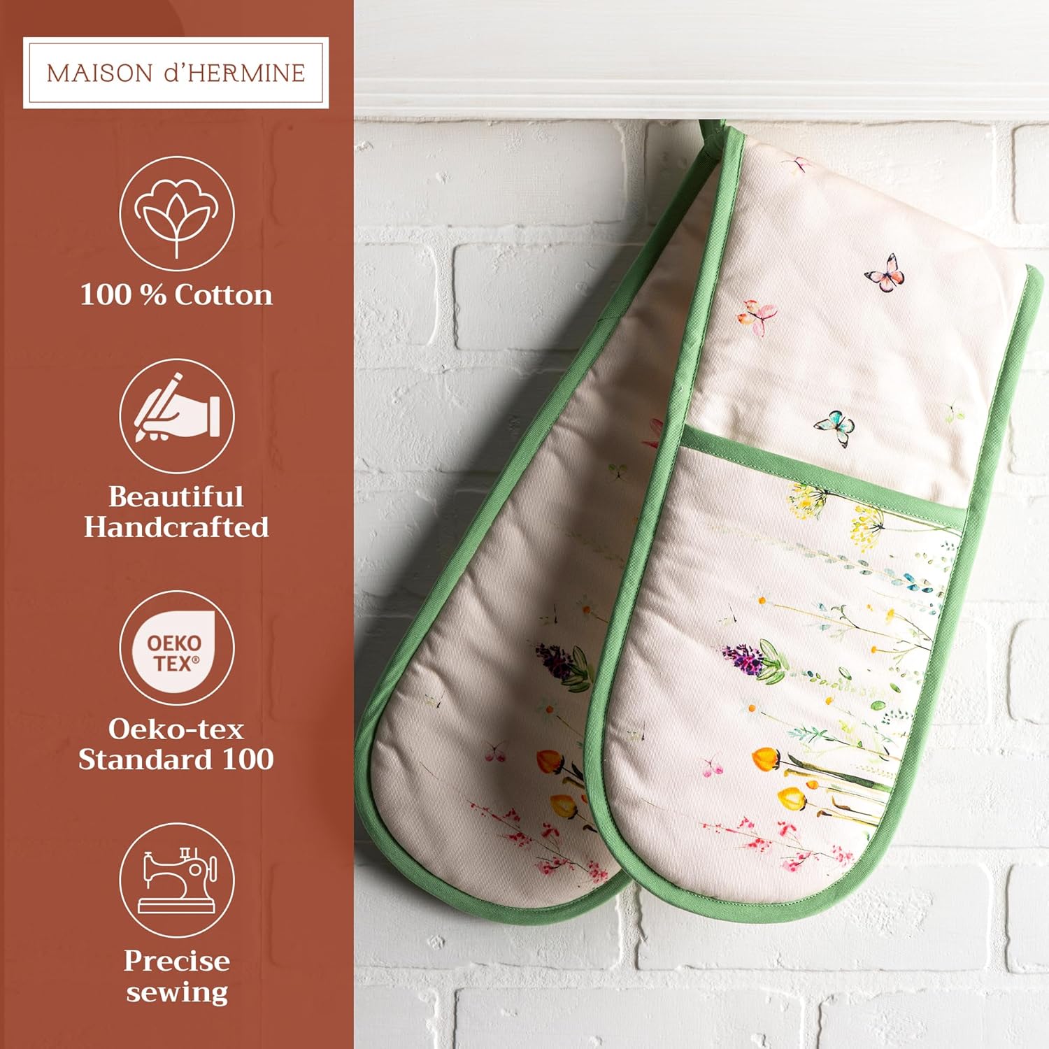 - Package includes: Includes 1 double oven mitt sized 7"x35". Perfect for handling hot cookware safely while adding a touch of European elegance to your kitchen. Designed in Europe and made in India with care