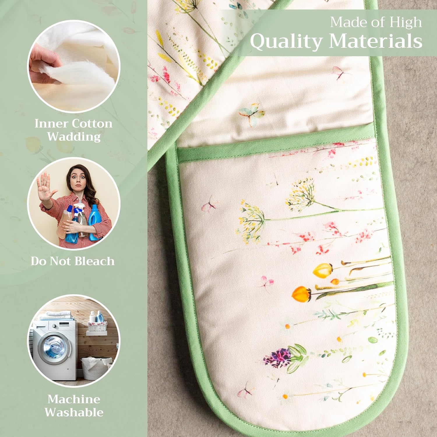 - 100% Quilted cotton: Crafted from premium quilted cotton for superior heat resistance and durability. This double oven mitt offers a soft, flexible grip and protects your hands during baking, roasting, or grilling