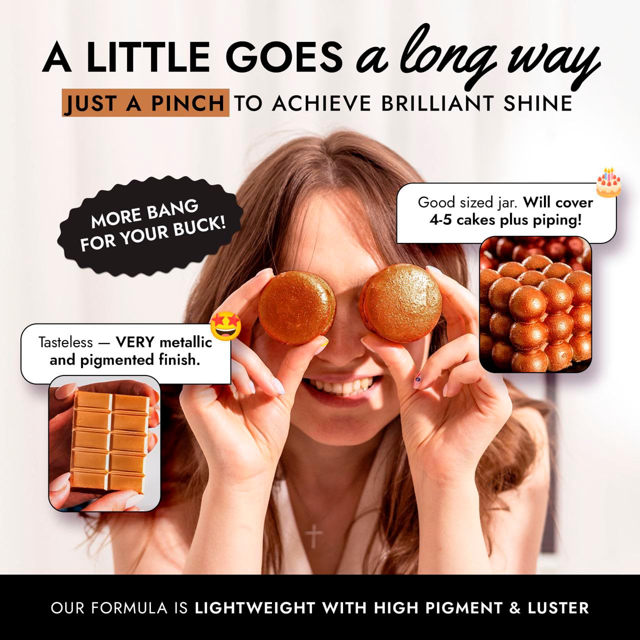 - EASY TO USE: Our bronze rose gold luster dust is incredibly versatile. Apply with a wet brush, airbrush, or dry brush, and even mix into beverages. Achieve professional-looking results effortlessly at home, whether decorating cakes or adding shimmer to cocktails.