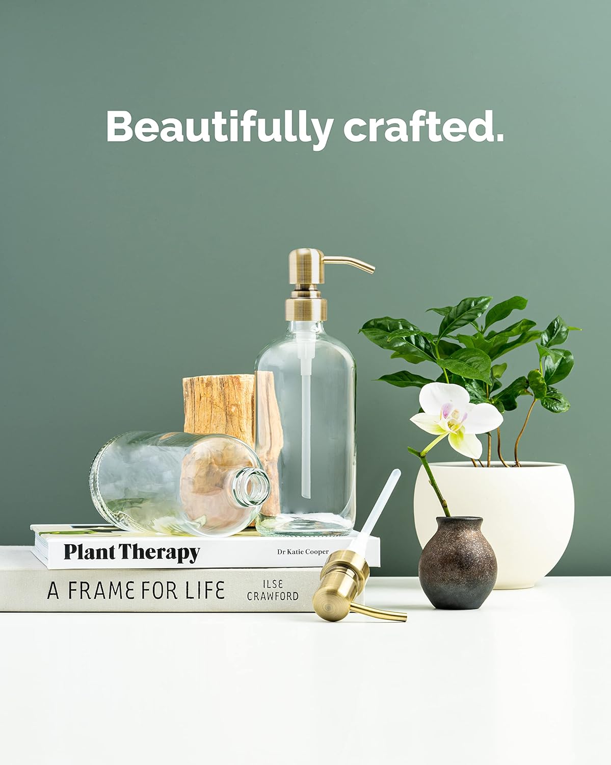 - UNRIVALED CONSTRUCTION - Set of 2 premium fortified glass soap dispenser with pump. 16 Oz shampoo dispenser, bathroom soap dispenser set for daily use. Vine Creations soap dispensers are Lead-free.