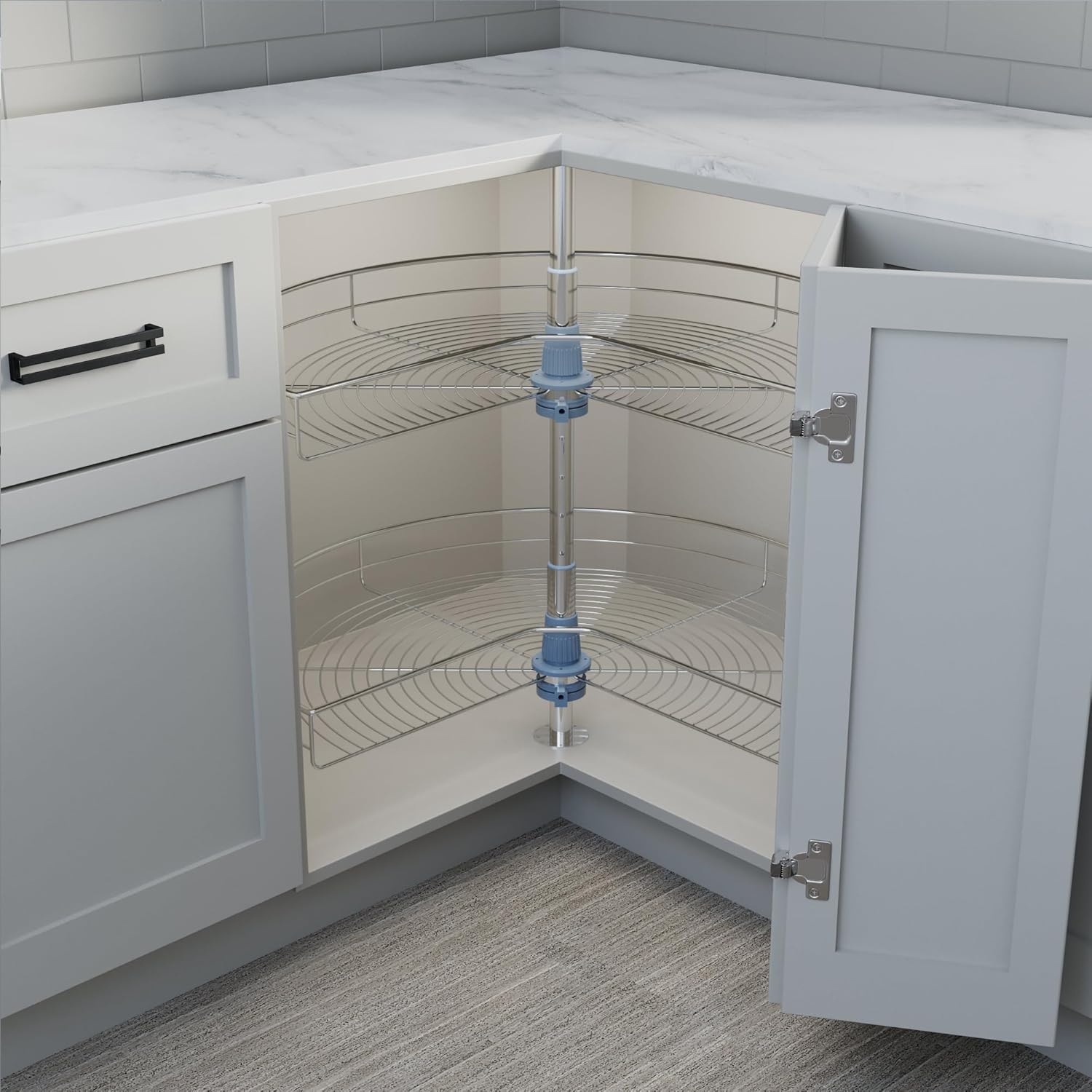 - DESIGNED FOR BASE CORNER CABINETS: Each shelf is kidney shaped (also called pie shaped or 270 degrees) in order to fit easily inside a base corner kitchen cabinet with a hinged diagonal door. The actual diameter of the lazy susan is 32" so the ideal cabinet size is 36" with an internal clearance of 39-42". No part of the lazy susan will attach to the door. Final assembly must be completed inside the cabinet to ensure fit.