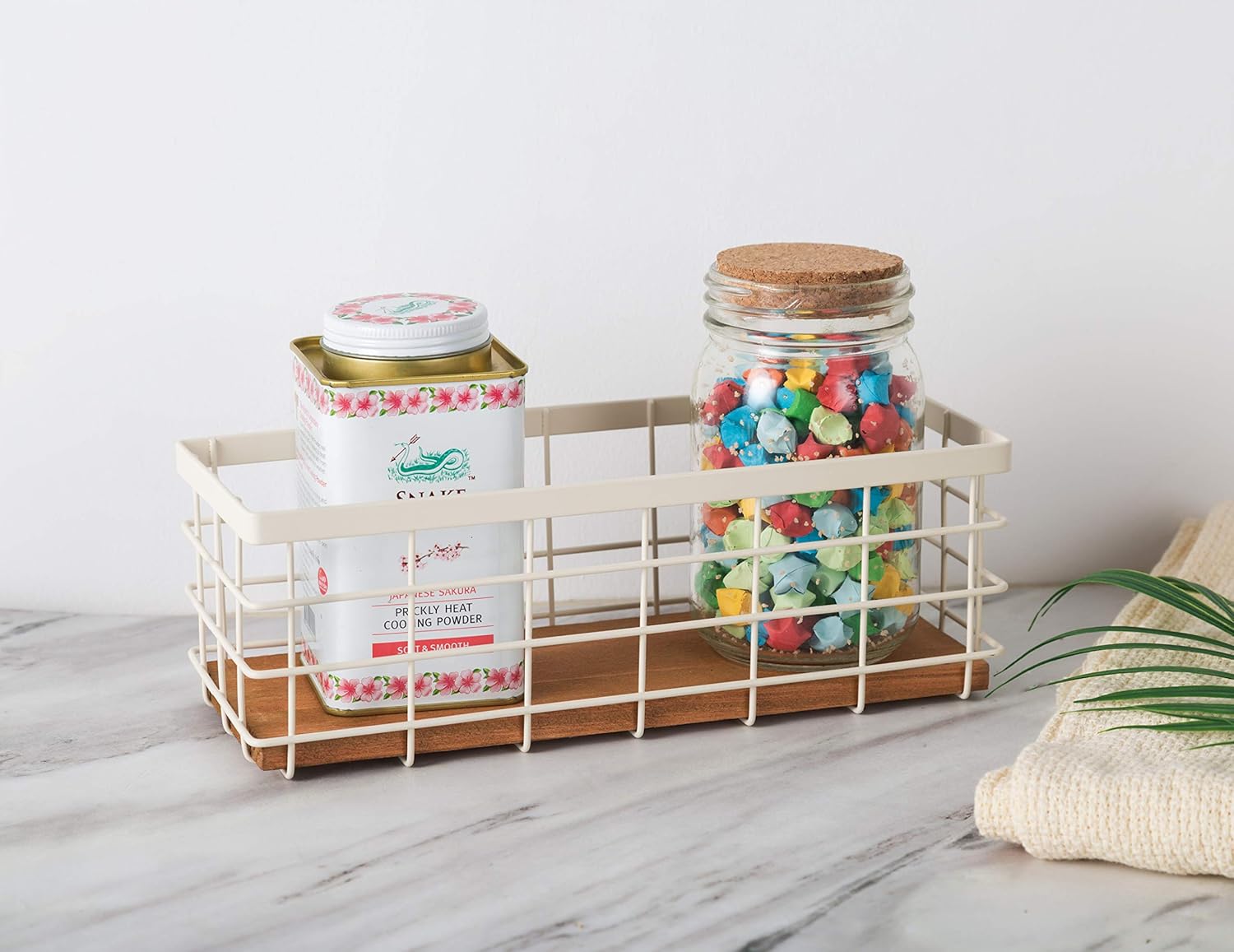 TIEYIPIN Small Metal Wire Storage Basket, Detachable Wood Base Storage Organizer Bin Basket for Kitchen Cabinets, Bathroom, Pantry, Garage, Laundry Room (Cream White, 4 Pack)