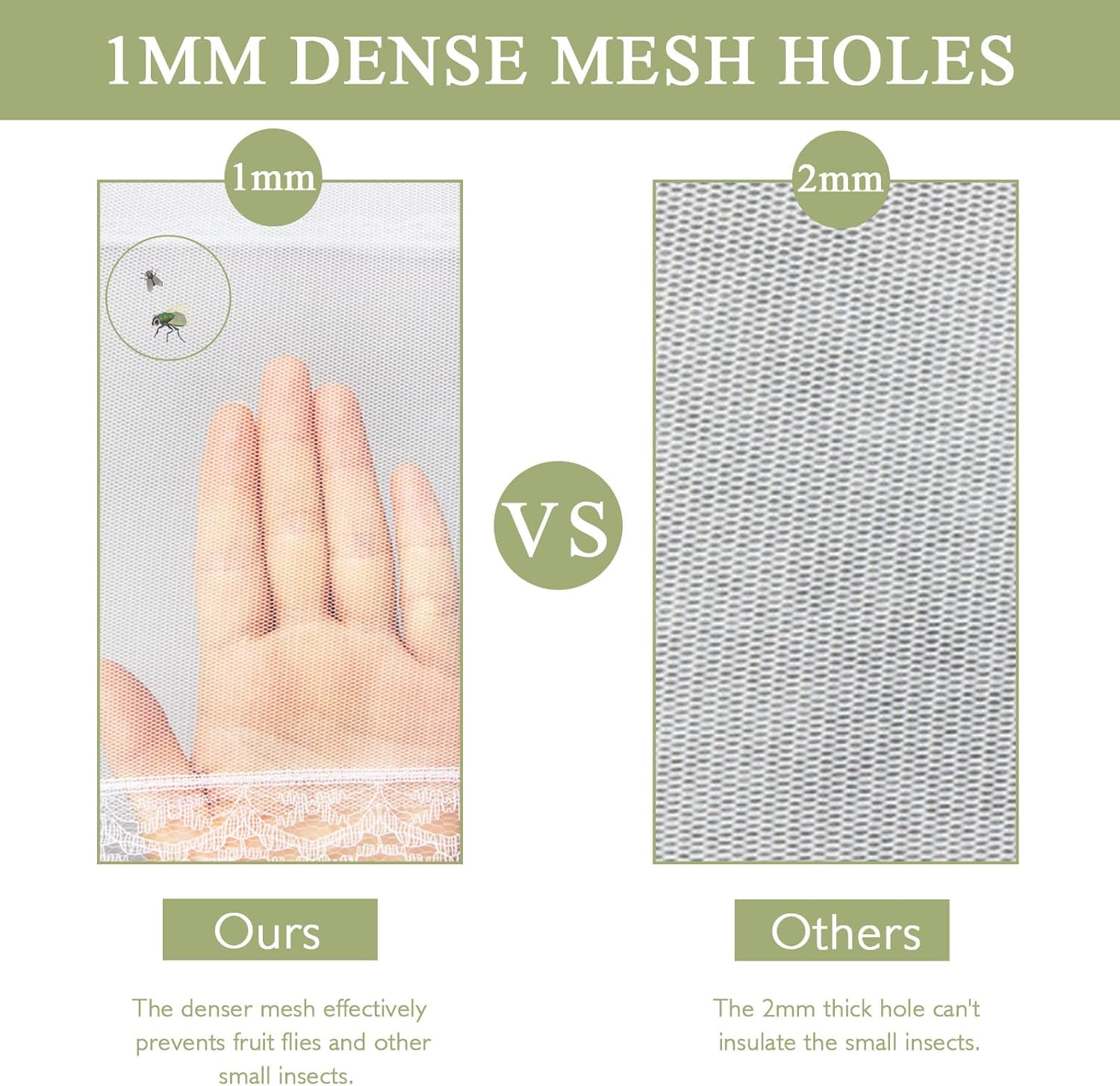 - [UPGRADE 1MM DENSE NET] This food covers for outside mesh uses an upgraded version of 1mm dense mesh, which provide superior protection against small flying insects.The elegant lace design at the bottom adds a touch of sophistication while effectively preventing bugs from reaching your food.