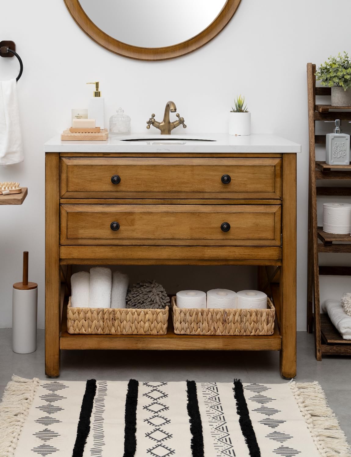 - Bathroom storage baskets are great for storing toilet paper rolls, small potted plants, scented candles, diffuser bottles, mason jars, hand towels, skincare products, etc.