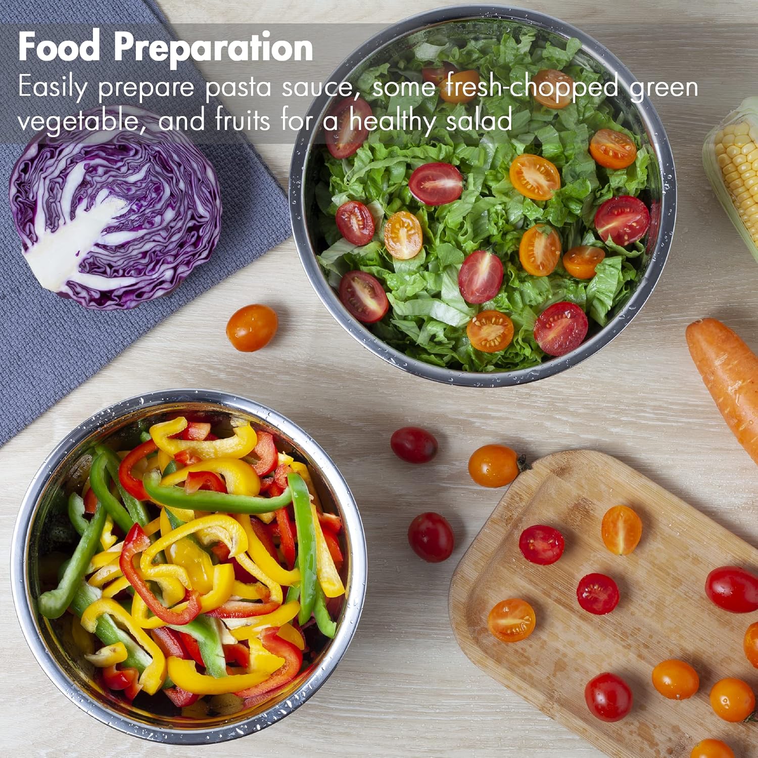 - Make Your Cooking Much Easier β Multi-purpose, stainless steel mixing bowl is essential to your everyday kitchen needs,7 different sizes of 4.5, 3.6, 2.7, 2.1, 1.7, 1.1, 0.7Qt will complement your cooking and make cooking much easier. Ideal for making a quick salad, preparing food, mixing batters, or storing and serving food.