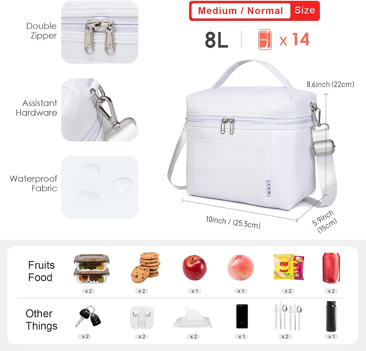 - Dimension & Capacity: this lunch box comes with two sizes: Small size: L8.3 x W5.5 x H6.7 inches, capacity: 4L, Medium size: L10.24 x W5.91 x H8.66 inches, 8L. Actually, the small size one can fit 6 cans of cola or 2 standard bento boxes+some fruits, it is a good choice for women. And the medium size one is a normal size of lunch bag.