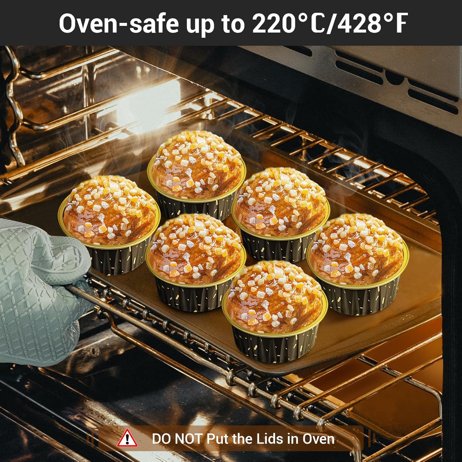 - 【 Aluminum Foil】-Made from sturdy thick aluminum foil with mooth surface, enables our ramekin cups with faster heating.