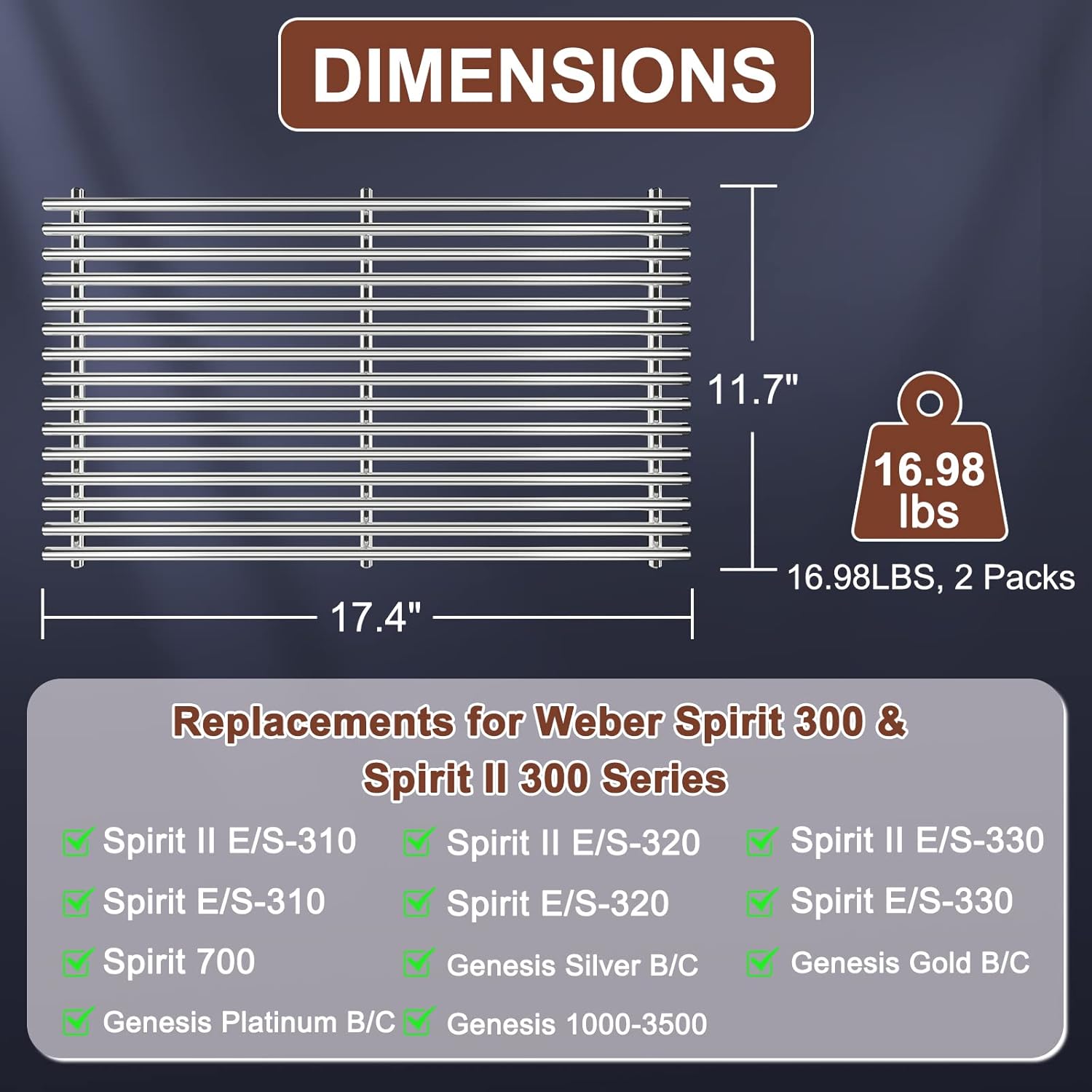 - đ„ăDIMENSIONS & PACKAGEăEach grate measures 17.4 x 11.7 inches, with a total size of 17.4 x 23.4 inches for the set of 2 SUS304 grill grates. These grates are designed to fit Weber Spirit 300 grill grates, Weber Spirit E-310 grates, and similar models
