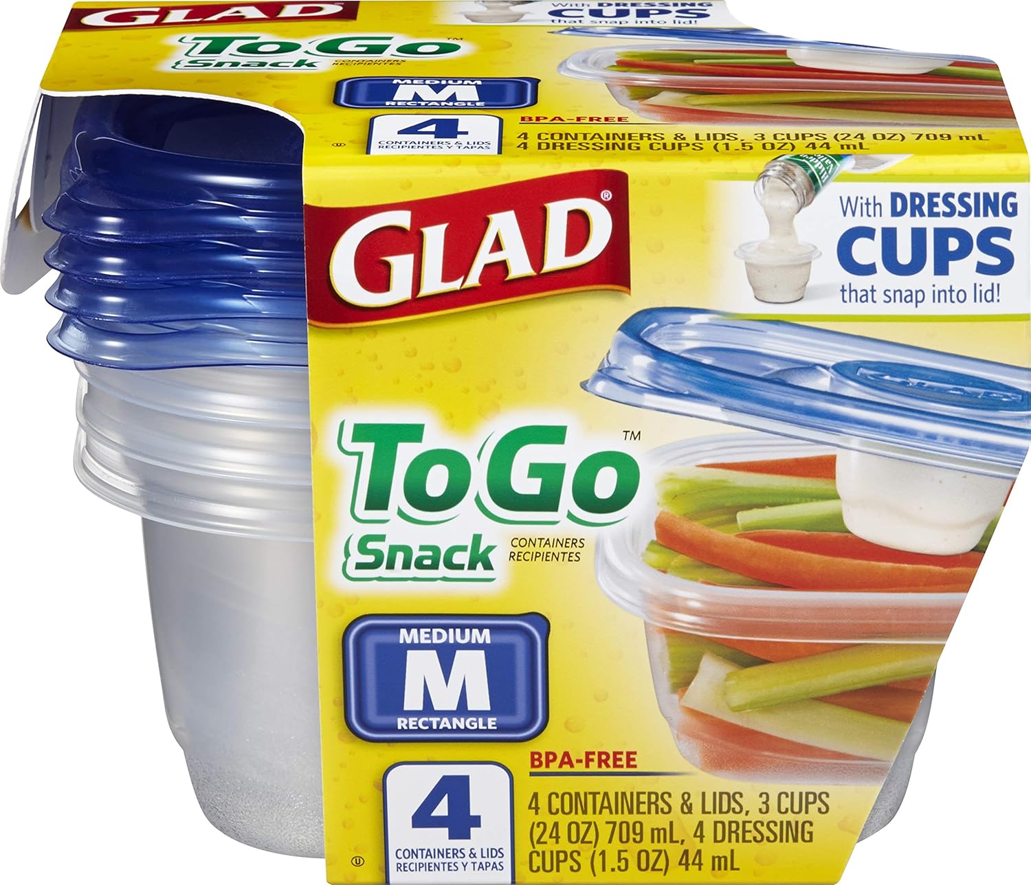 - THE RIGHT SIZE FOR EVERYTHING β GladWare comes in many shapes and sizes to suit your needs. The To Go Snack container can hold 24 ounces of food, making it perfect for a snack of carrots and celery, plus 1. 5 ounces of dressing or dip