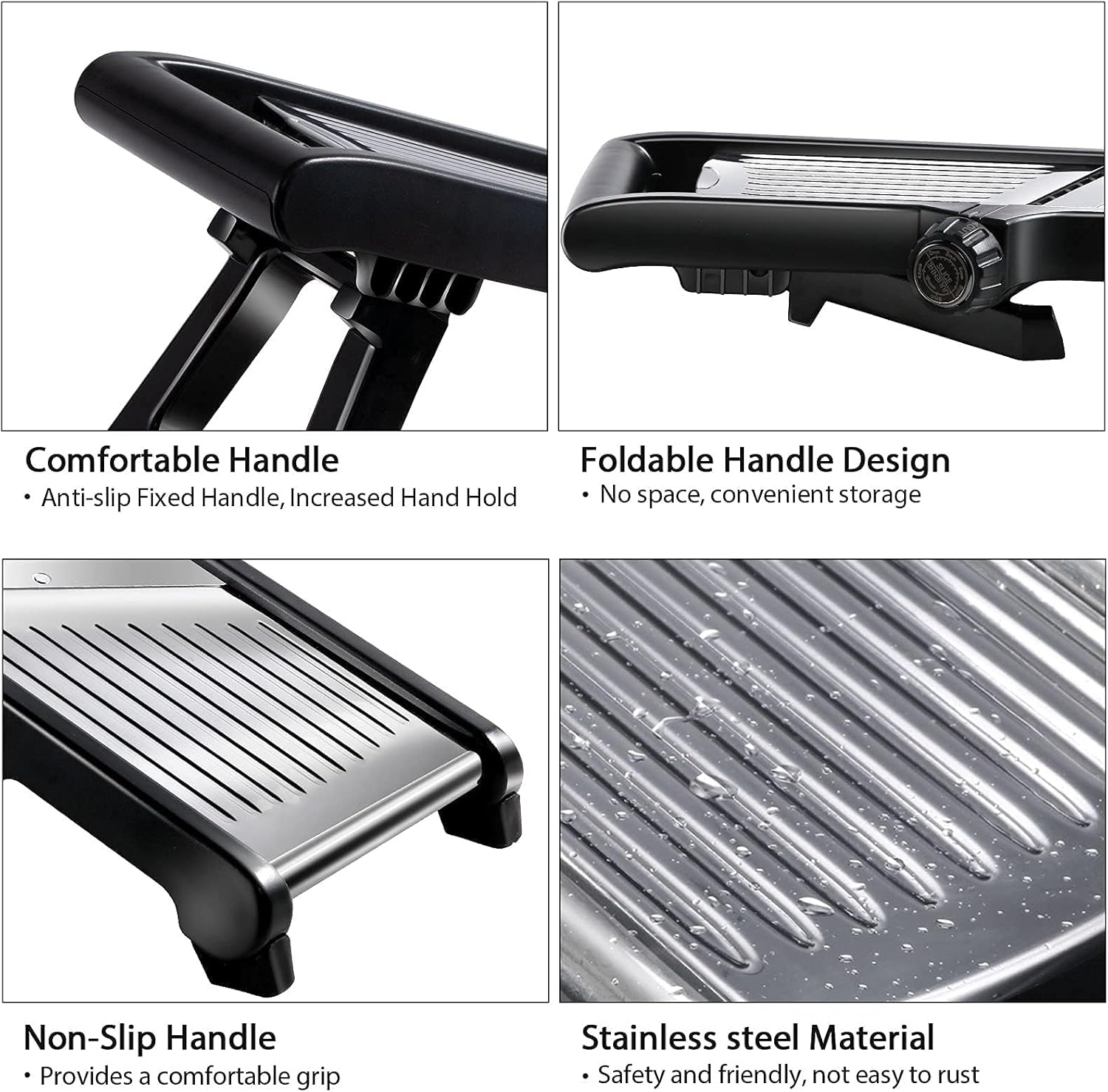 - Save Space: The blades are built-in and does not require extra space for storage. The support handle and anti-slip feet are foldable, making it comfortable to use and easy to fold and store. The slicer can be folded into a flat form for easy storage in a drawer.