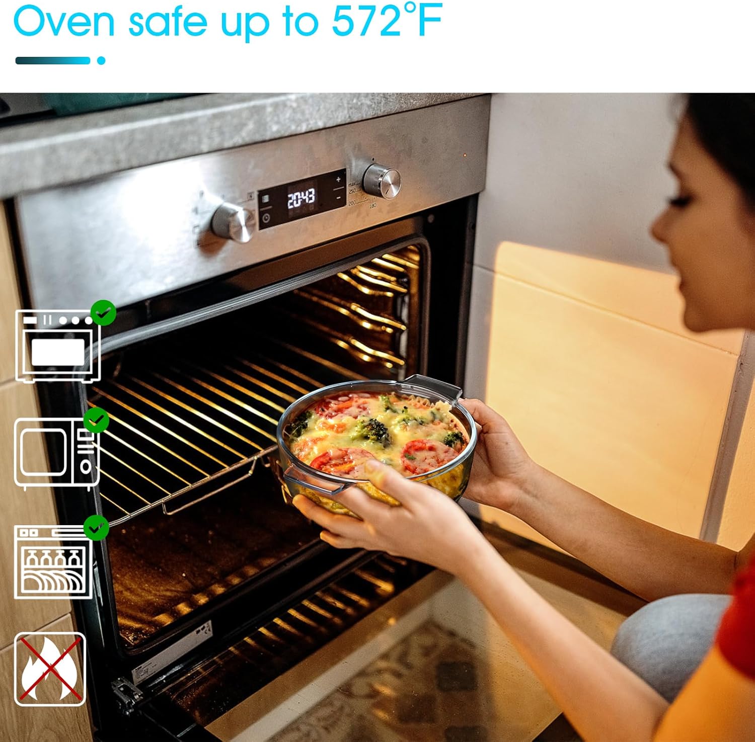 - Microwave, Oven, Freezer, Dishwasher Safe: This glass casserole dish is oven safe up to 482Β°F. Dishwasher safe or hand wash for quick, easy cleanup. Each casserole dish with lid will be a powerful helper in the kitchen. NOTE: No direct fire or induction cooker.