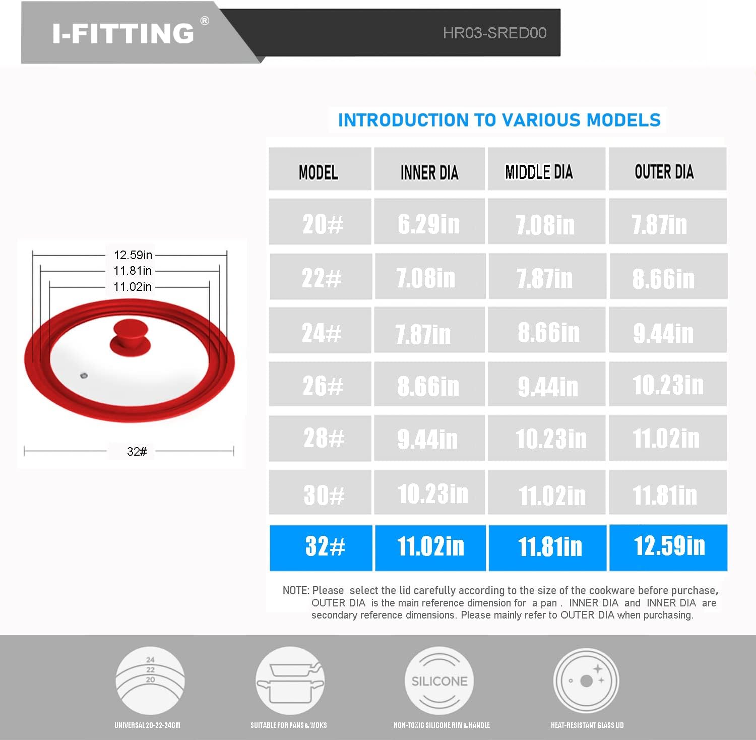 - 【UNIVERSAL LID WITH STEAM VENT】 Universal silicone glass cover lid suitable for pan/pot/skillet/saucepan/frying pan/soup pot , can fit 11” ,12” ,12.5” (28,30,32CM ) cookware. Designed with stainless steel steam vent, effectively prevent overflow during cooking