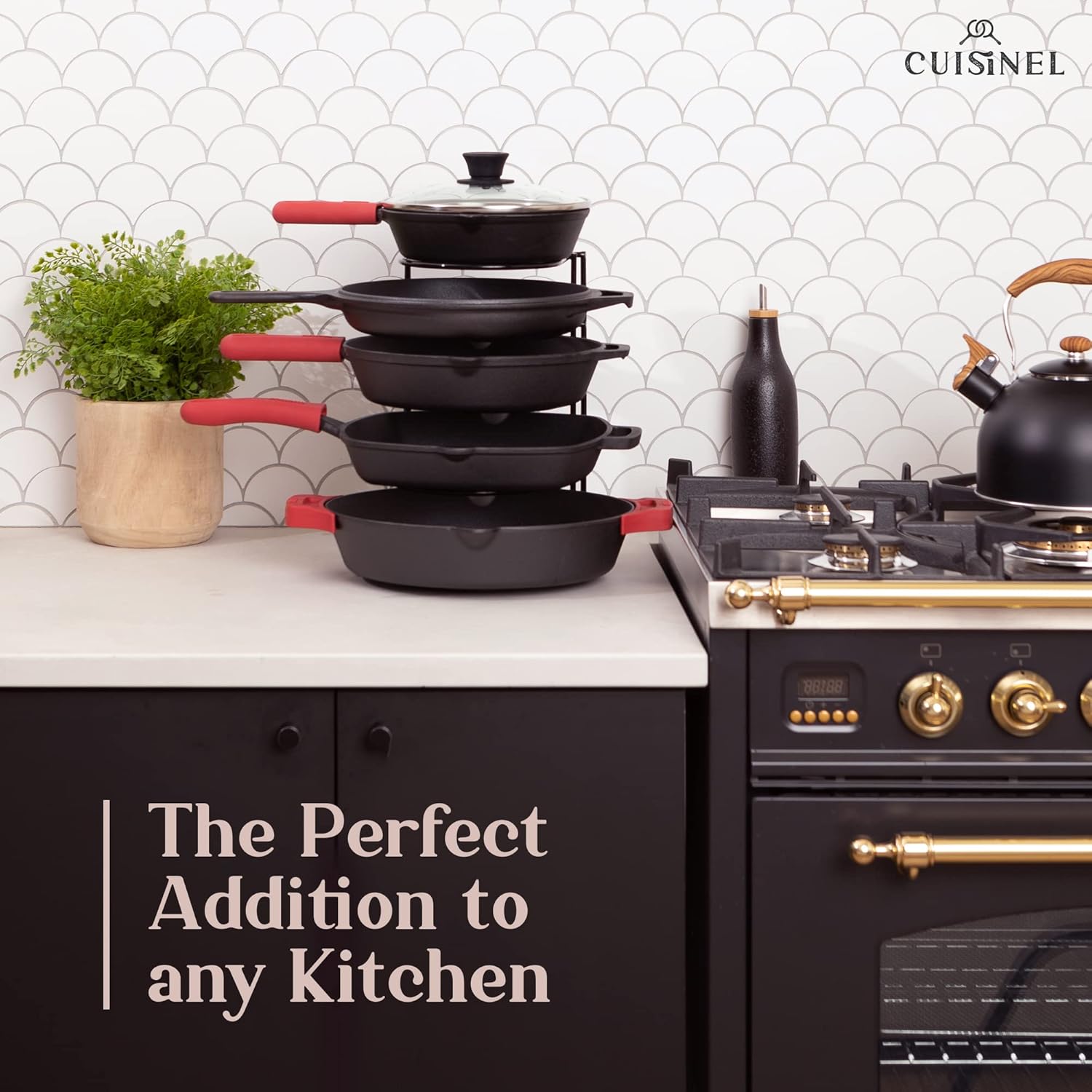 - 5 TIER HEAVY DUTY CONTRUCTION - No more buckling under the weight! These heavy duty organizers can handle up to 50-lbs of cast iron cookware or even the highest gauge metal cookware. Along with the innovative food-grade silicone-coated wire shelves, you can be confident in the function of this great looking rack!