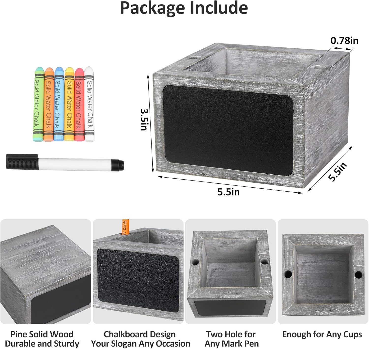 - 【Perfect Size For Party Cups】This wooden cup holder can accommodate most party cup sizes, including cups ranging in size from 10, 12, 16, and 18 ounces! Package included-You will receive a wooden grey cup holder with two marker slots and chalkboard, one marker pen and six different color solid water chalk. Use our party cup holder for the perfect addition to any party!