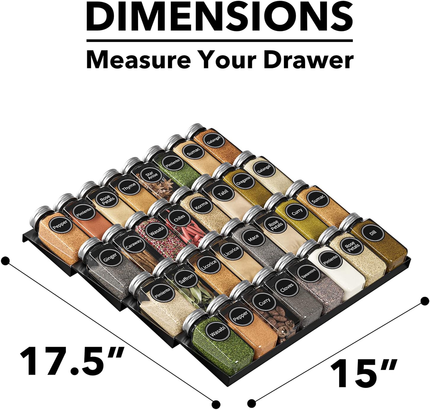 - Complete Drawer Spice Organizer Set: 1 x Drawer Spice Rack, 32 x Square Empty Glass Spice Jars, 386 Spice labels