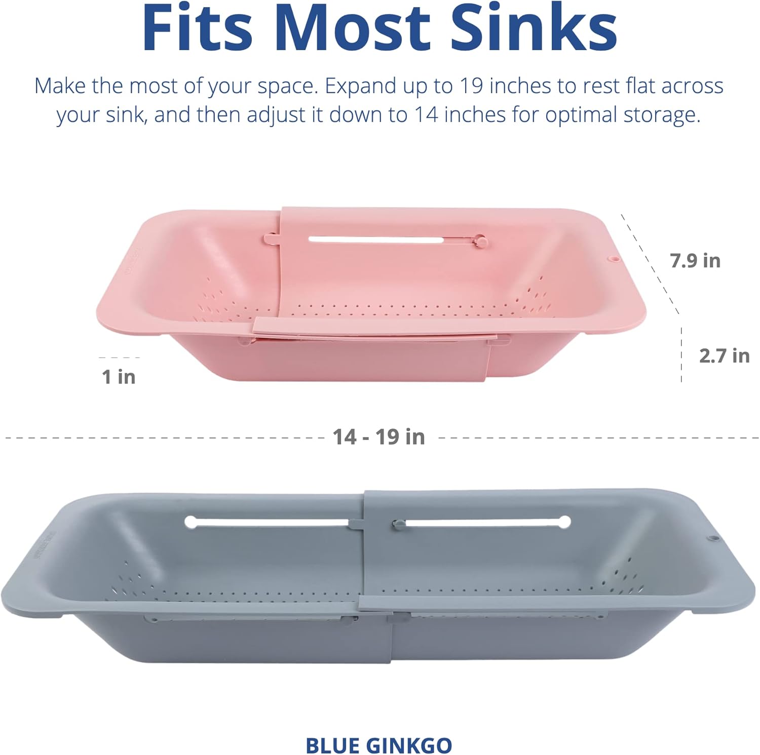 - Modern Design - Adjustable, this colander expands from 14 to 19 inches to hold more or less, save space when not in use and fit most sinks. When stretched over the sink, the bottom is raised from your sink base, preventing drained pasta water from backing up into your food.