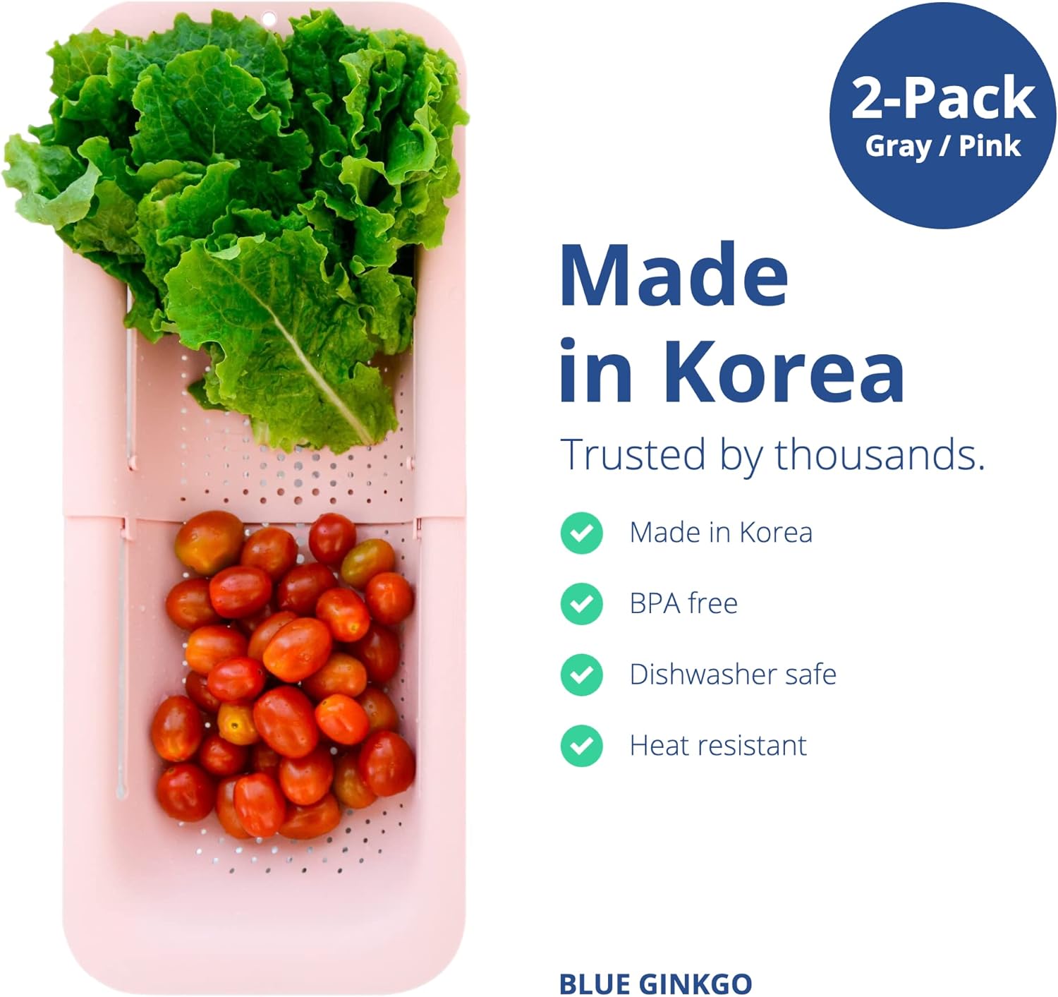 BLUE GINKGO Sink Colander Baskets - (Pack of 2) Wash Vegetables and Fruits, Drain Cooked Pasta and Dry Dishes - Extendable - New Home Kitchen Essentials (Grey & Pink)