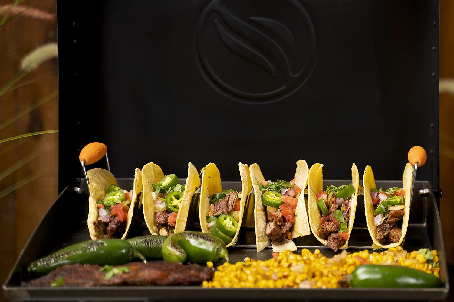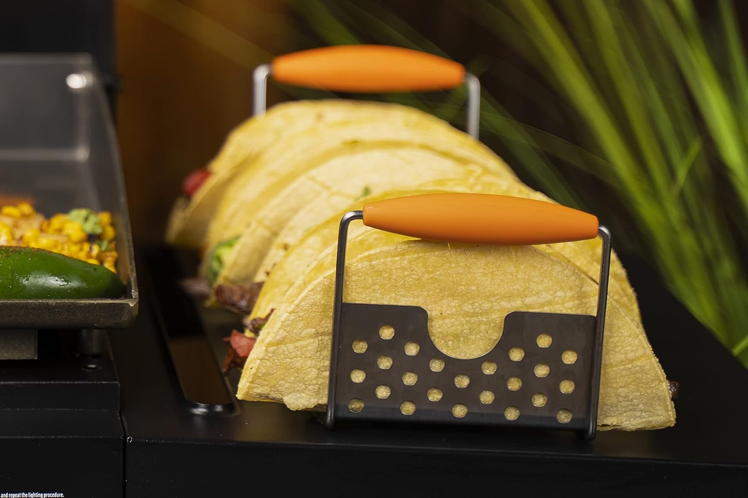 BLACKSTONE 5173 Deluxe Holder Stand Pack of 2 Stainless Steel Racks with Heat Resistant Handles-One Tray Holds 6 Tacos-Dishwasher Safe, Orange/Silver