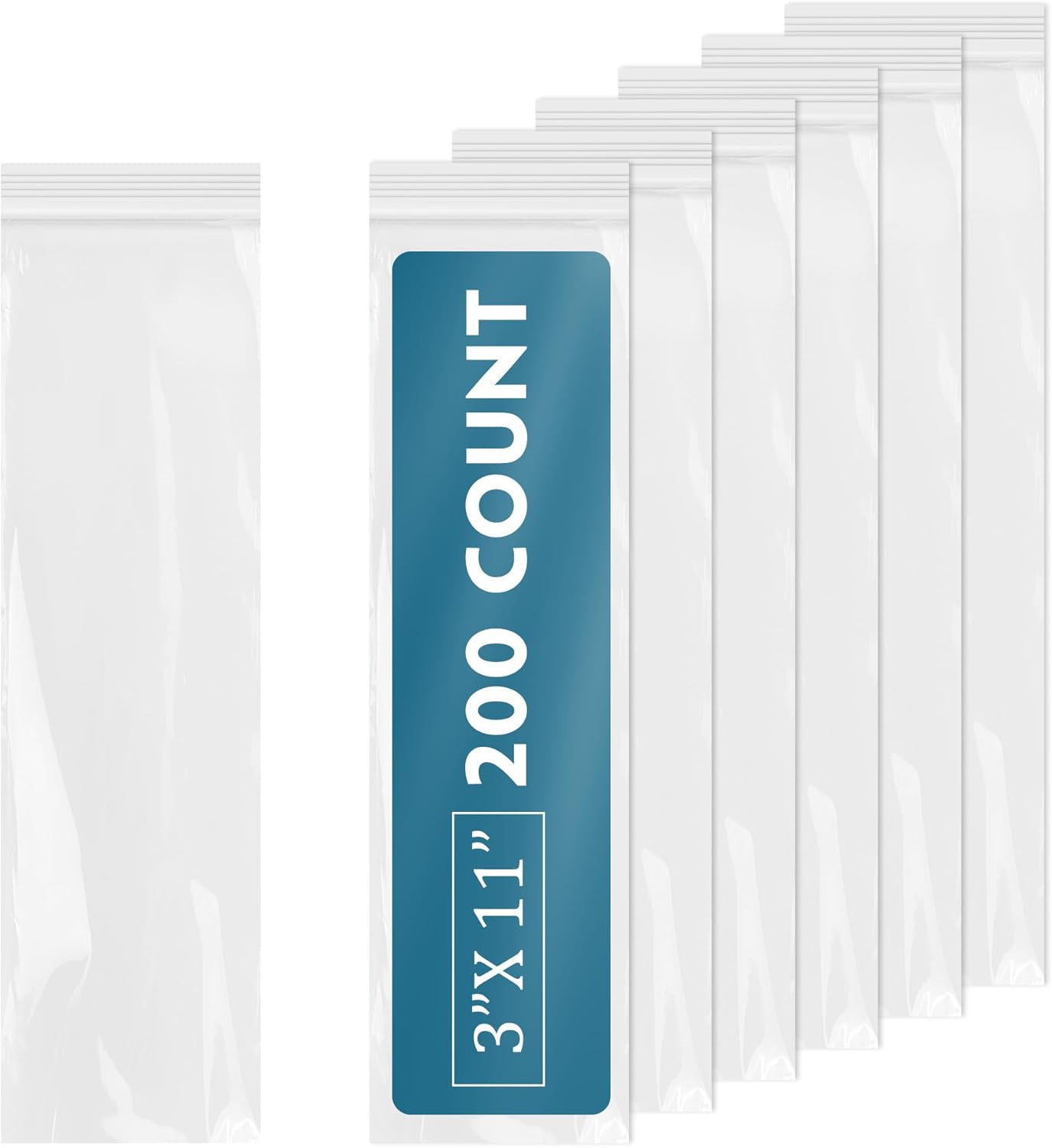 - [Specification]: 200 PCS - 3" x 11"(Excludes Glue Flap) Resealable Zip Poly Bags - Self Sealing. 2 Mil Thickness.