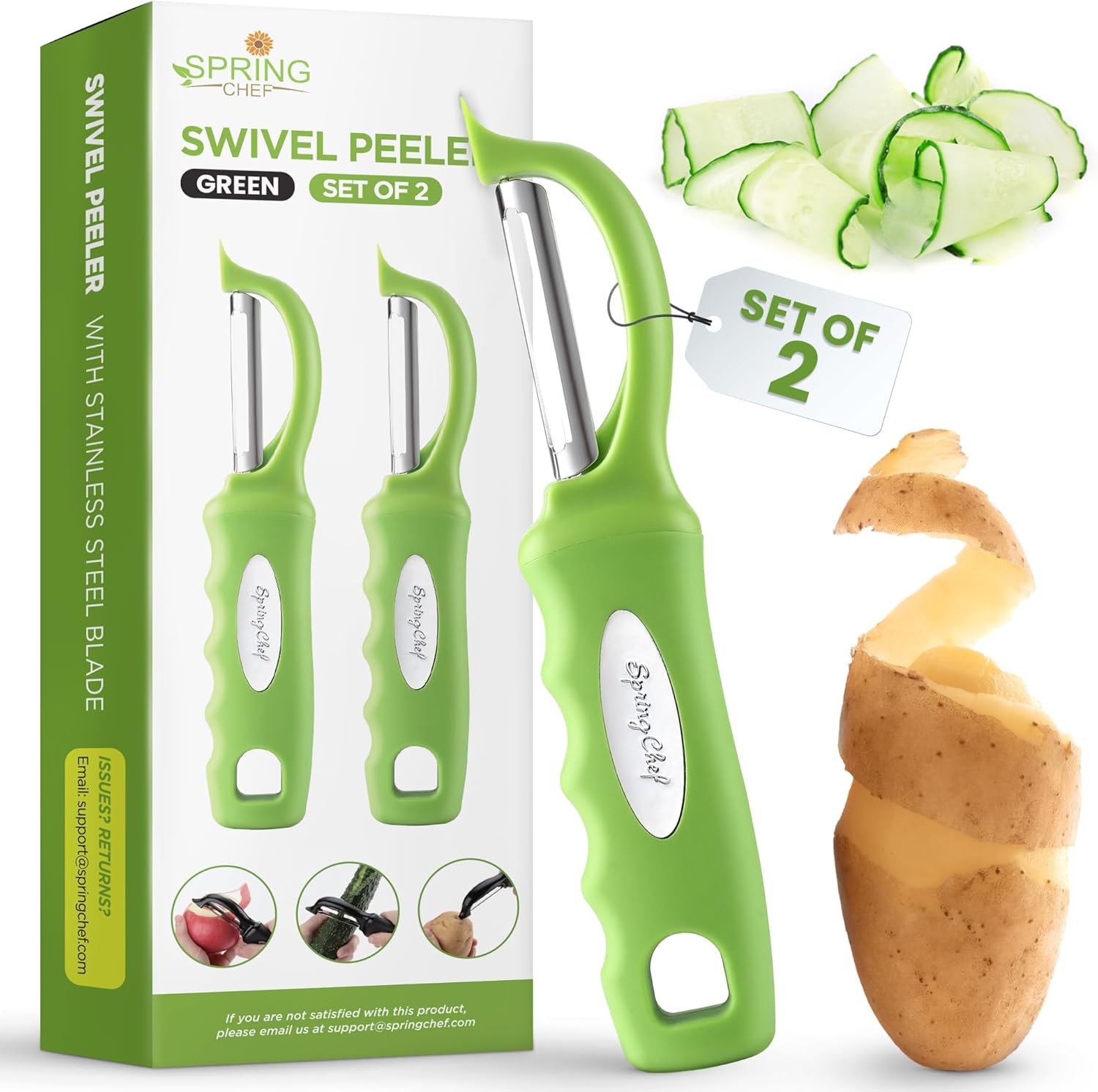 Spring Chef Premium Green Swivel Vegetable Peeler Set of 2, Stainless Steel Apple Peeler for Kitchen with Soft Grip Handle, Dishwasher Safe, Perfect for Potato, Carrot, Veggie, Fruit, Apple, Mango