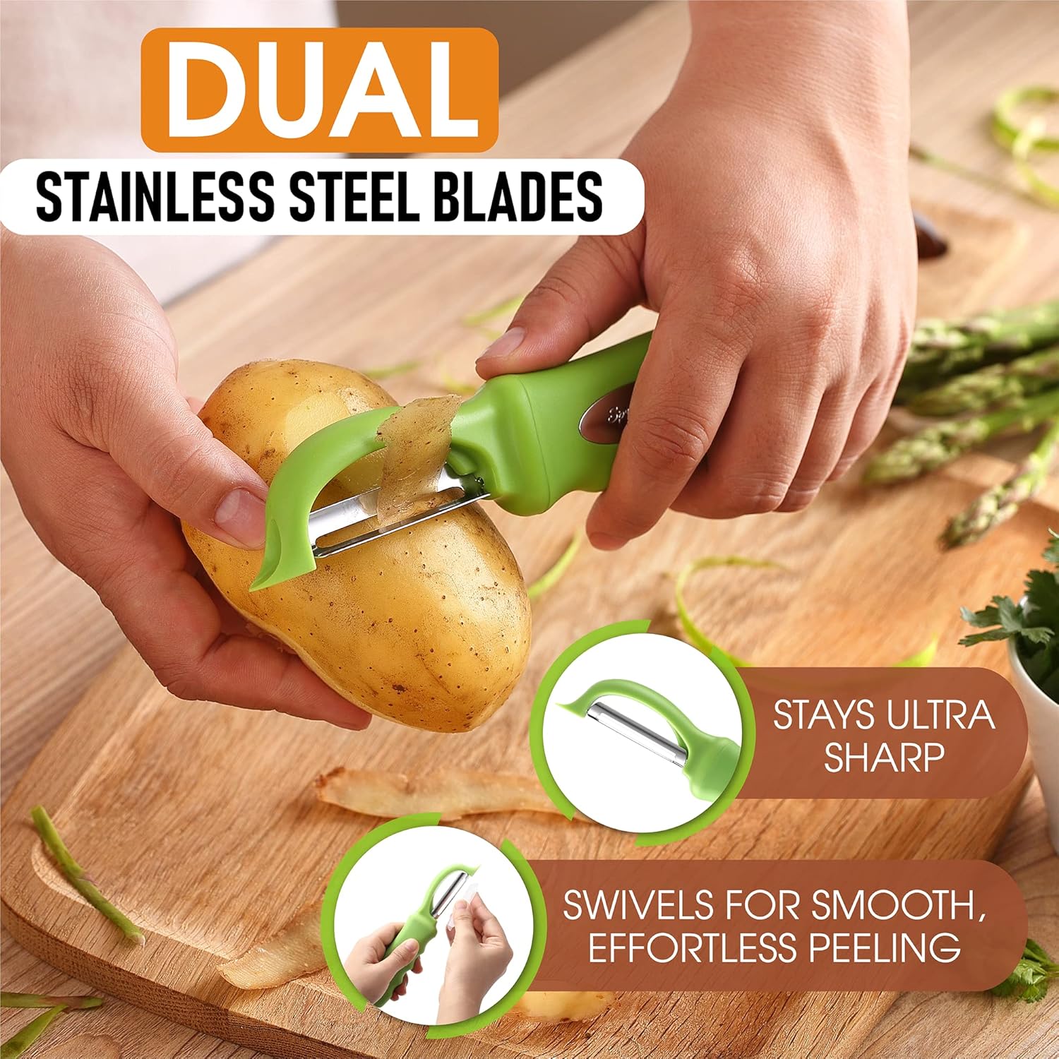 - Smooth, Effortless Peeling - Dual Stainless Steel blades stay ultra sharp and swivel to glide along fruits and vegetables easily. Includes a built-in blemish remover.