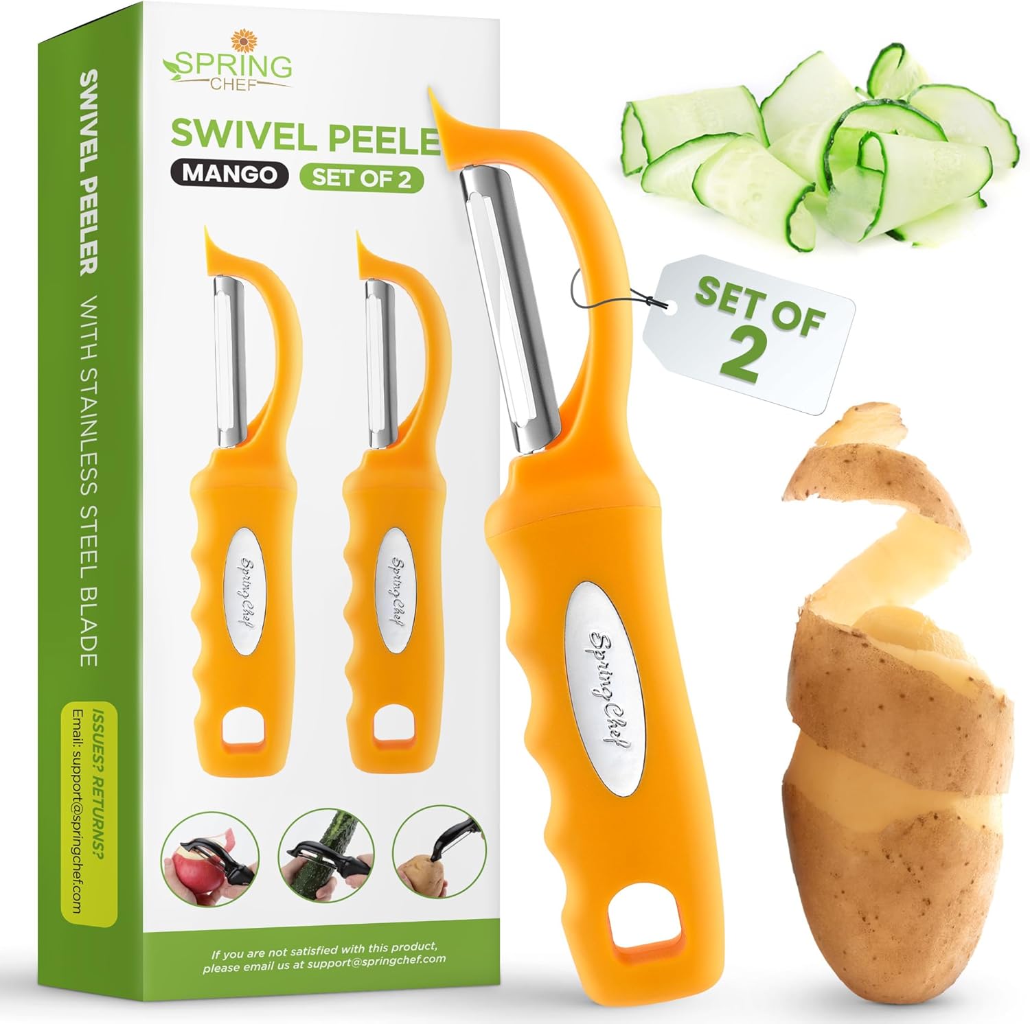 Spring Chef Premium Stainless Steel Swivel Potato Peelers for Kitchen, Metal Vegetable Peelers with Comfortable Handle for Apple, Cucumber, Veggie, Fruit, Carrot, Dishwasher Safe - Set of 2 - Mango