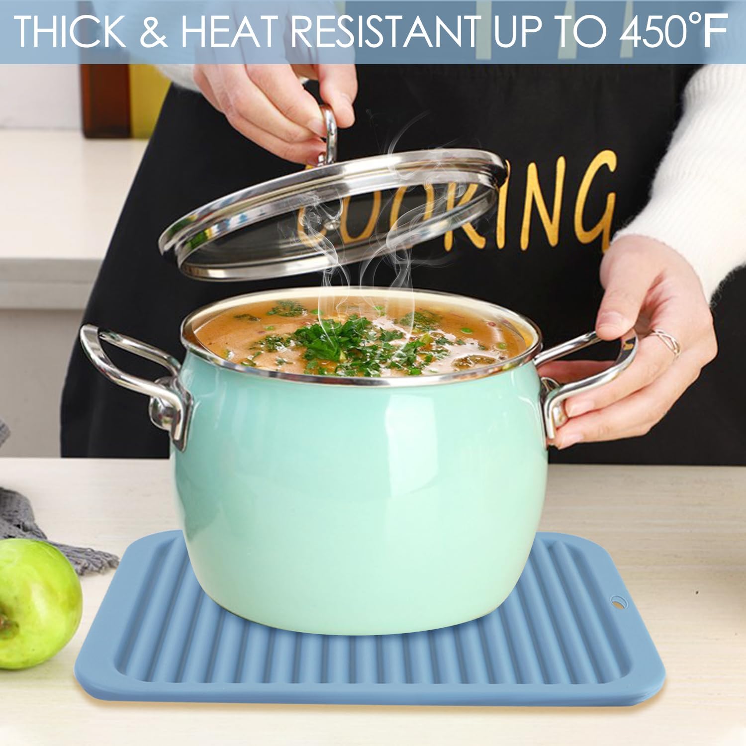 - HEAT RESISTANT TRIVETS MAT: The large blue silicone hot pads are great for countertops & hot Items, the heat resistant trivets mat set of 2 can withstand cold and hot temperatures from -104β to 446β (-40β to 230β). Reliable design helps protect quartz counter tops from hot pots, pans, drips, and spills. Help tremendously when we cook in multiple steps!
