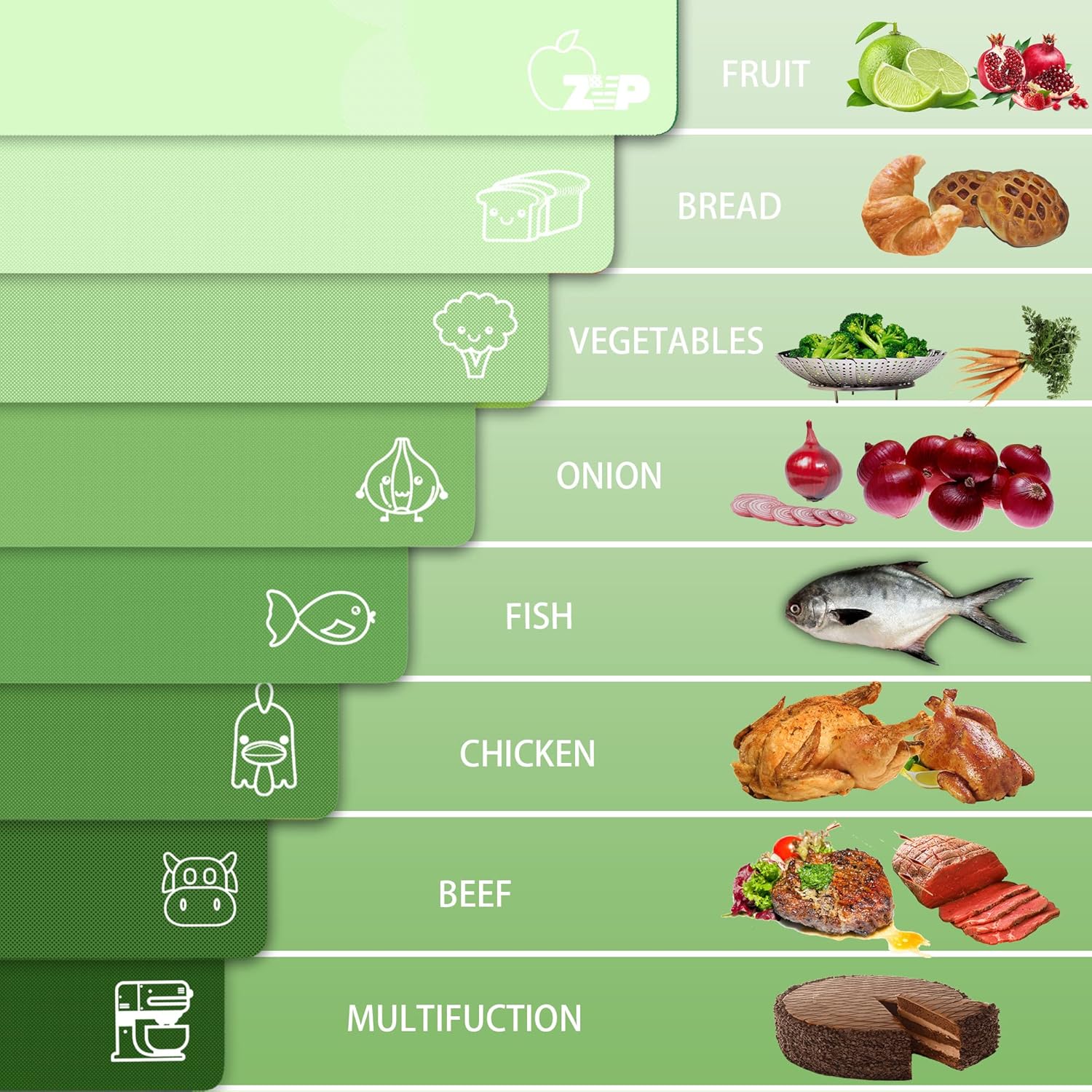 - Gradient Color: Unique color gradient style delivers a charming appearance. Decorative gradient color will beautify your kitchen. Each board with a cute food icon is convenient for you to classified Foods. The cutting boards with 5 different shades of green from light to dark for fruit, bread, vegetables, fish, and beef. Meet all your kitchen needs, is a must-have for your home.