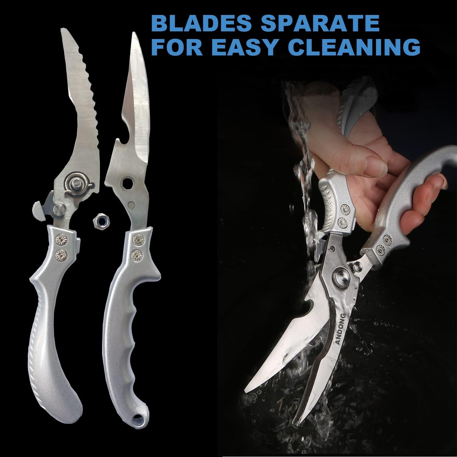 - Utility scissors heavy duty multipurpose kitchen Shears Spring Loaded work well for heavier jobs like spatchcocking a Turkey.You can use chicken shears for scrape scale fish,Cut fish maw,cutting crab claws,Cut seafood big lobster,BBQ tools Scissors,cut vegetables, sliced herbs, poultry meat and cartilage and more.ANDONG kitchen scissors can help you complete the entire kitchen work.It is your best assistant in the kitchen.