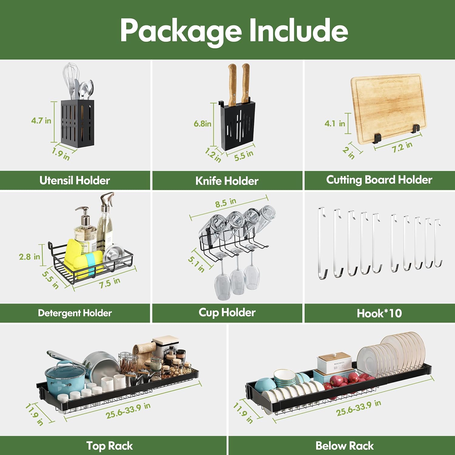 - π Expandable Design for Custom Fit: Adjust the over sink dish drying rack width effortlessly to span most standard single or double sinks, adapting seamlessly to your kitchen layout. The dish drain modular design allows rearranging tiers and accessories to prioritize space for tall glasses, wide pans, or cleaning tools, maximizing vertical storage above the sink