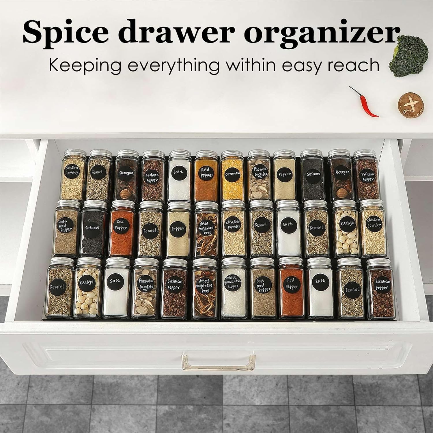 - 6PCS Spice Drawer Organizers: This spice drawer organizer set consists of 6 single slanted drawers that can hold up to 36 spice jars. The slanted design allows you to see all your spices at a glance, saving you time fumbling through the drawers.