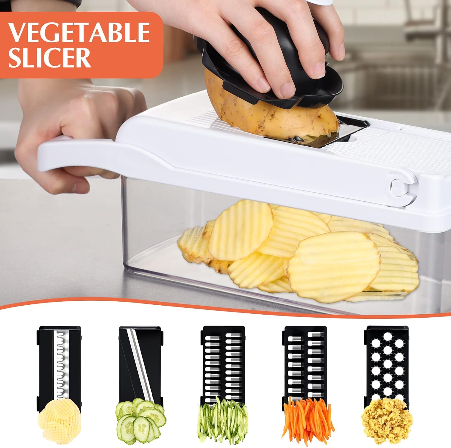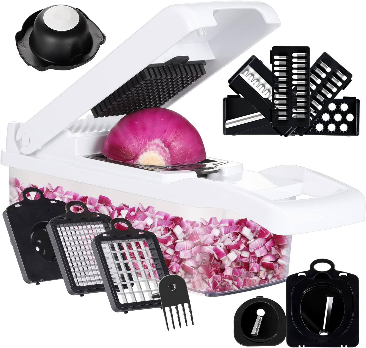 - 🧅Save Time in Preparing Veggies: Vegetable chopper and dicer in one, 10 changeable blades let you shred, chop, dice, and slice veggies. Meet all your chopping needs. It can get the job done all at one time and save you time for half. If you want to dice an onion, easily done in under a minute.