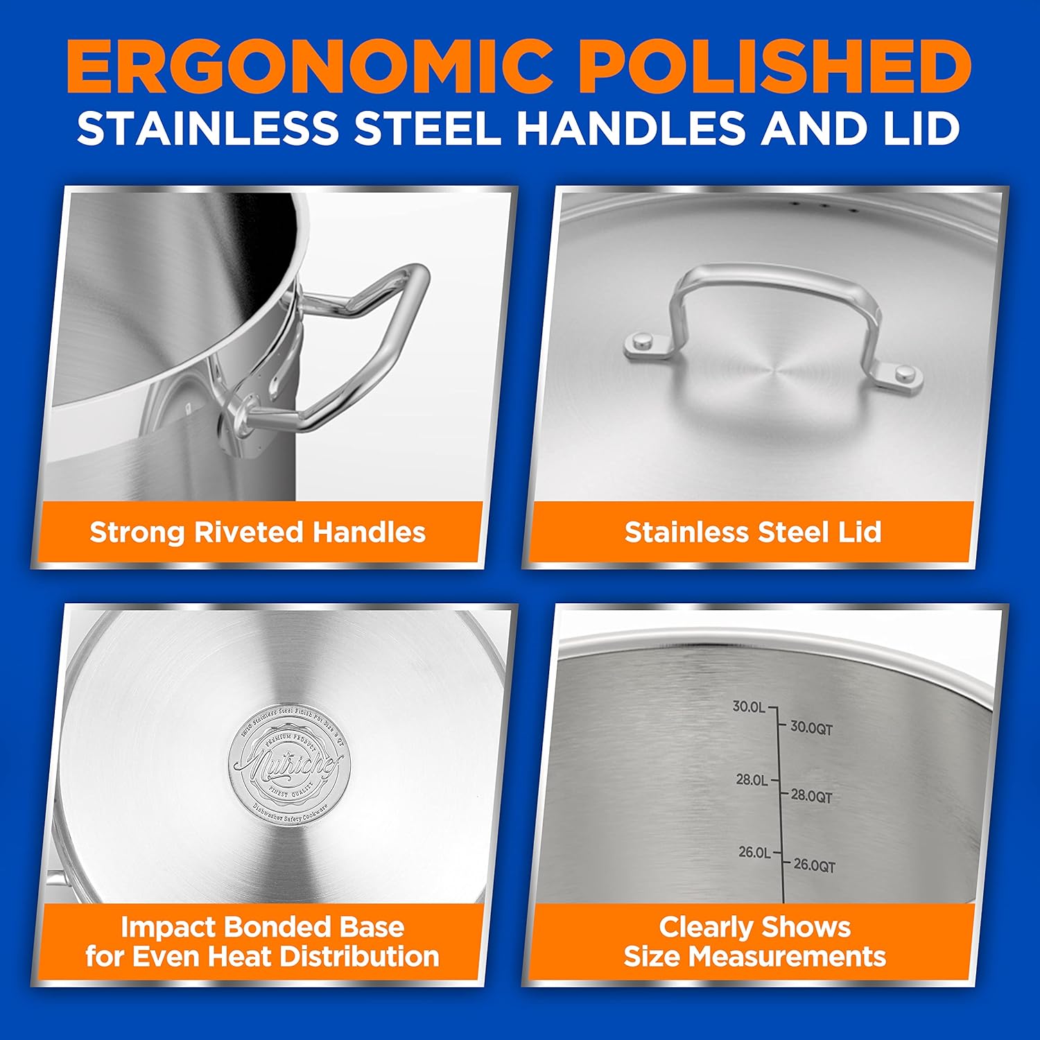 Nutrichef Stainless Steel Cookware Stockpot, 30 Quart Heavy Duty Induction Soup Pot With Stainless Steel Lid And Strong Riveted Handles, Even Heat Distribution, Compatible With Most Cooktops