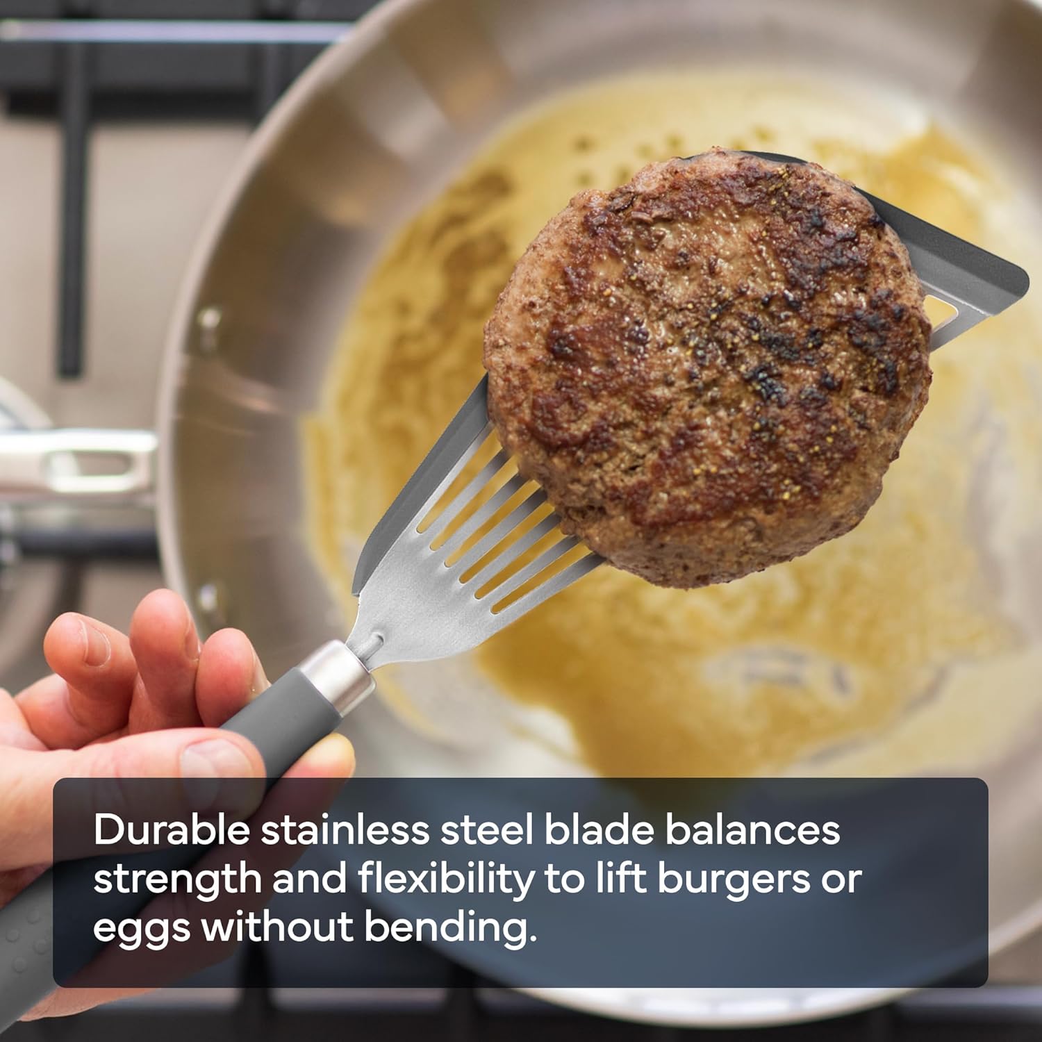 - PRECISION IN EVERY FLIP: This wide-slotted turner is perfect for cooking a variety of meals. Whether it's delicate eggs, sizzling fish, meaty burgers, or fluffy pancakes it allows you to fry and flip with ease, ensuring your creations are cooked just the way you desire.