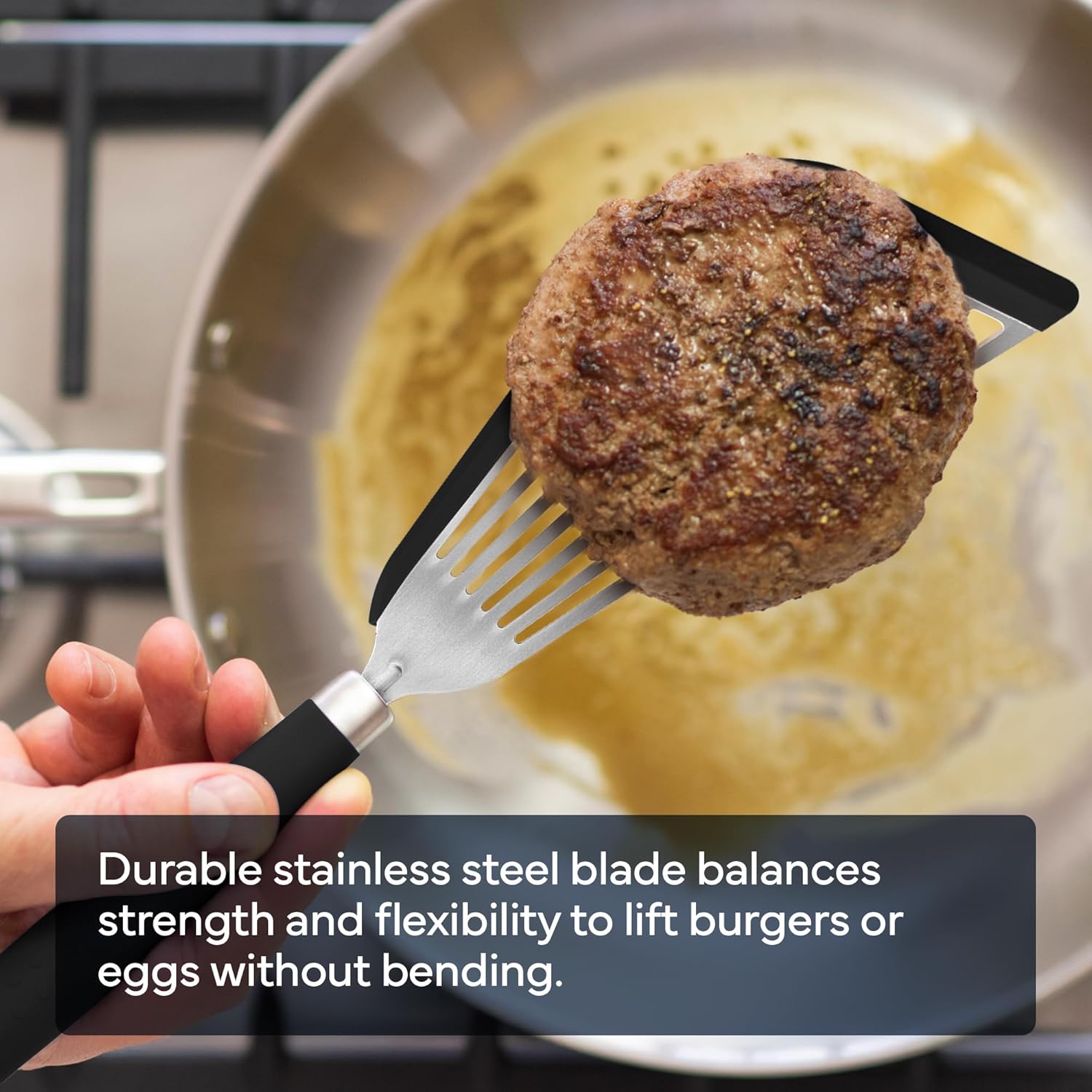 - PRECISION IN EVERY FLIP: This wide-slotted turner is perfect for cooking a variety of meals. Whether it's delicate eggs, sizzling fish, meaty burgers, or fluffy pancakes it allows you to fry and flip with ease, ensuring your creations are cooked just the way you desire.