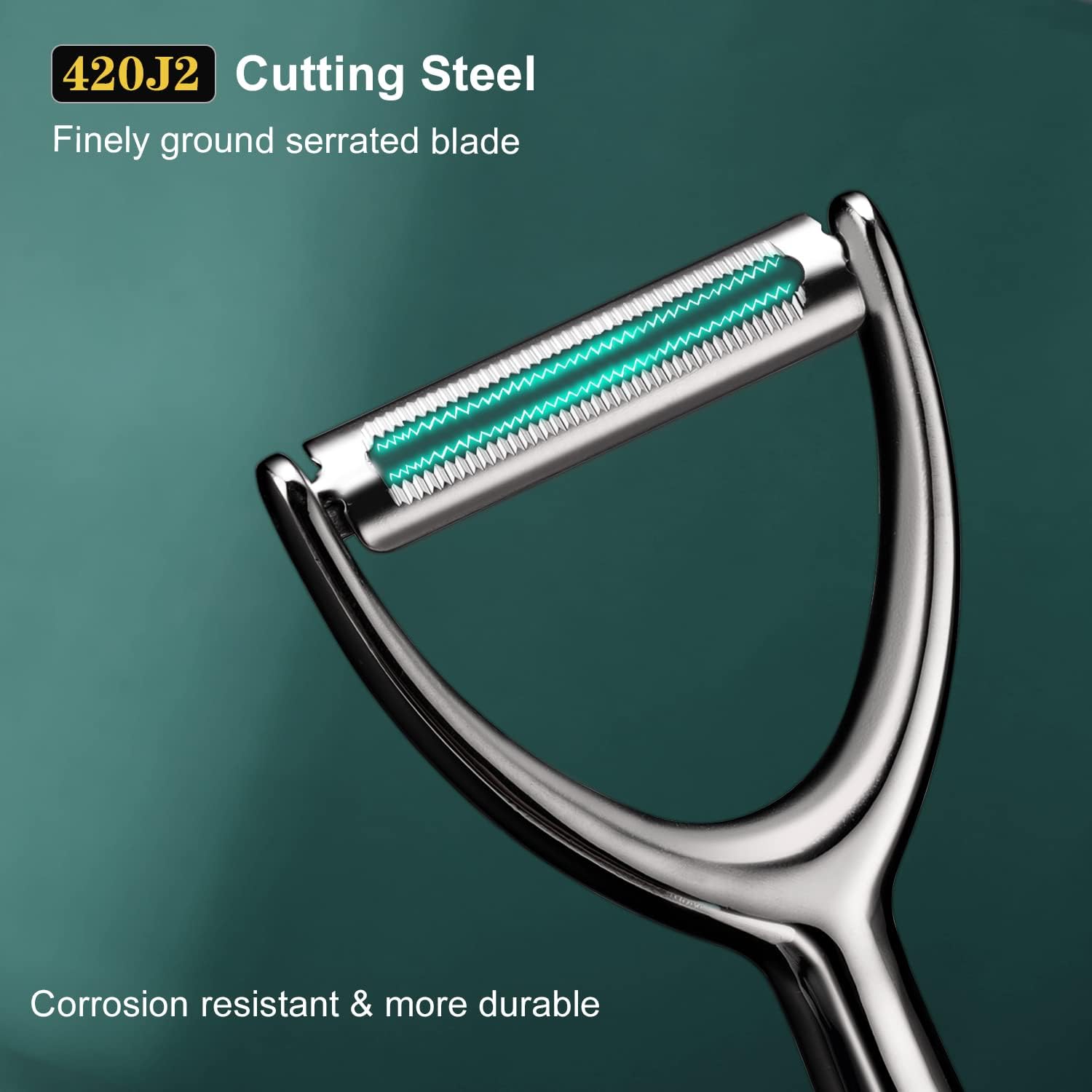 - 【Super Sharp & Swivelling Blade】The blade of stainless steel vegetable peeler is made of professional cutting steel (420J2), which is extremely sharp and durable. The kiwi/pumpkin/tomato peeler can perfectly fits the curves of fruits or vegetables, peel thin and reduce food waste.