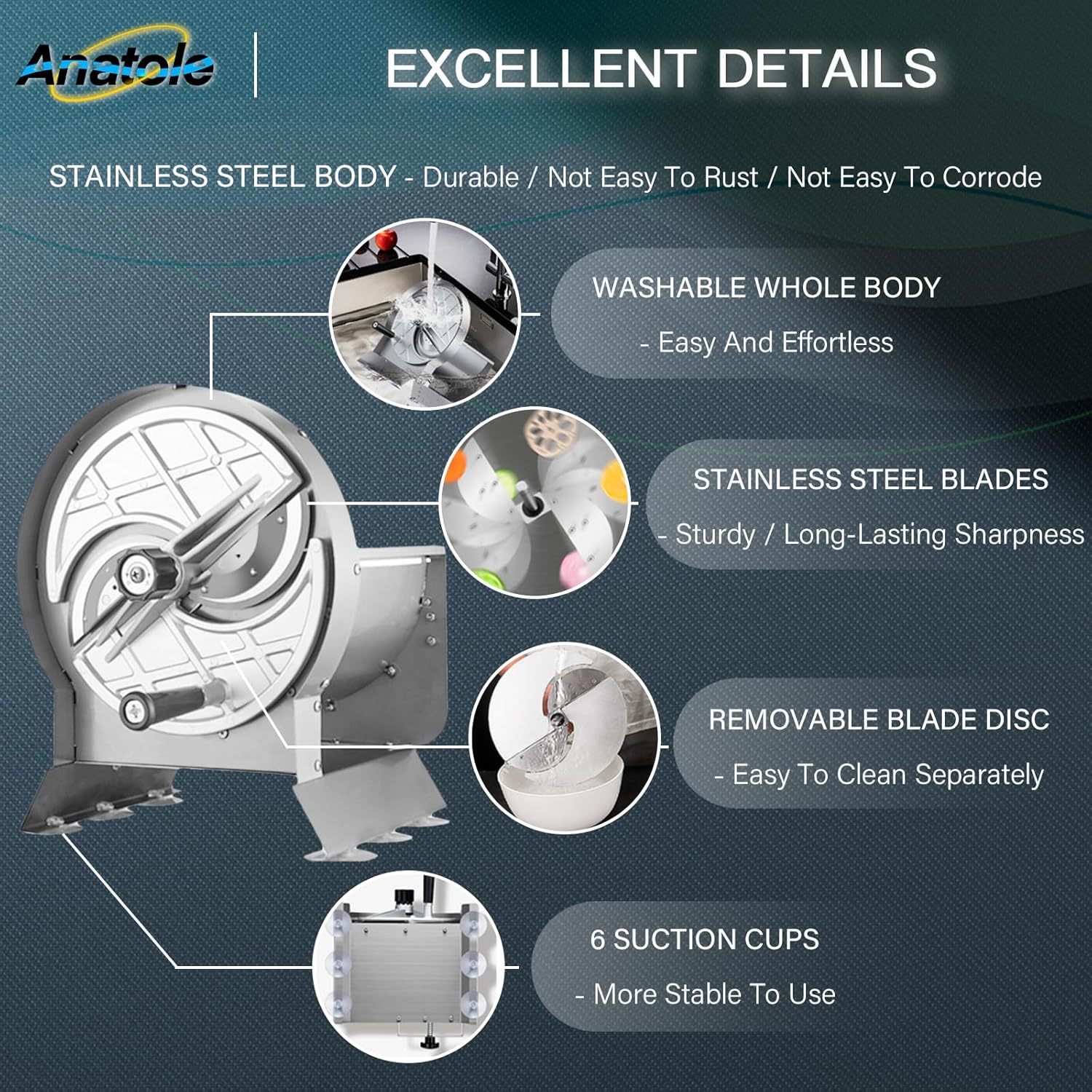 Anatole Commercial Vegetable Slicer Stainless Steel for Tomato Onion Potato Lime 0-0.5'' Thickness Adjustable Manual Fruit Cutter with 6 Suction Cups