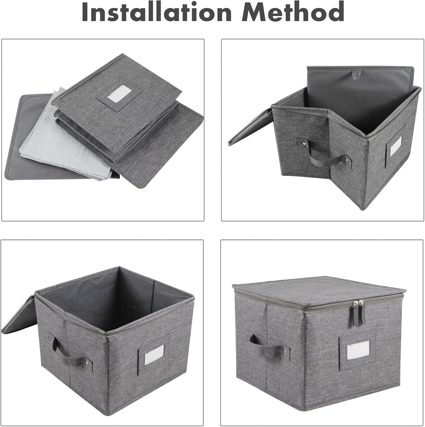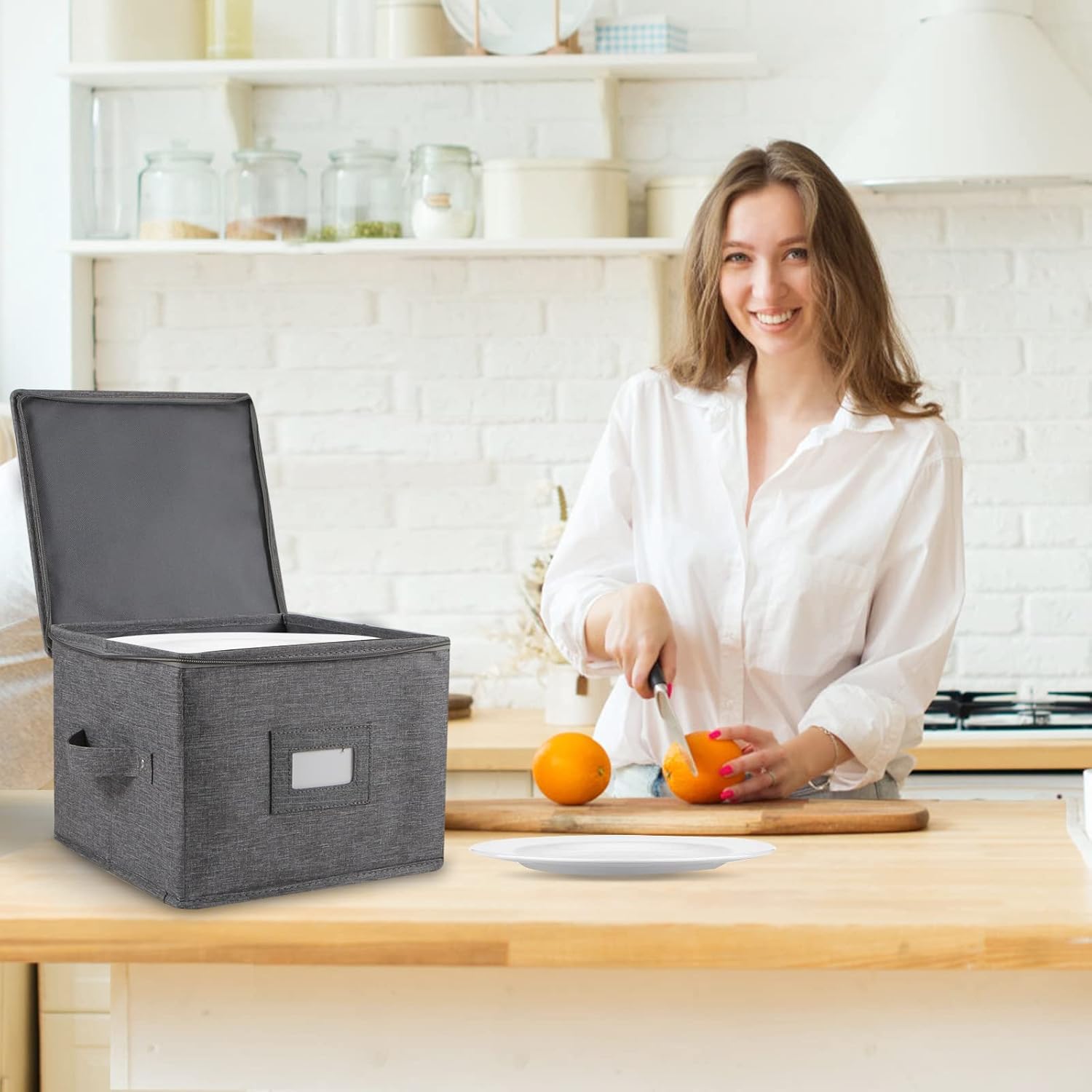 popoly China Storage Containers Hard Shell Inside 10" W x 8" H, Salad Plate Storage Containers for Dishes, Dinnerware with 24 Felt Dividers, Hold 24 Plates, Foldable and Stackable (2 Pack Grey)