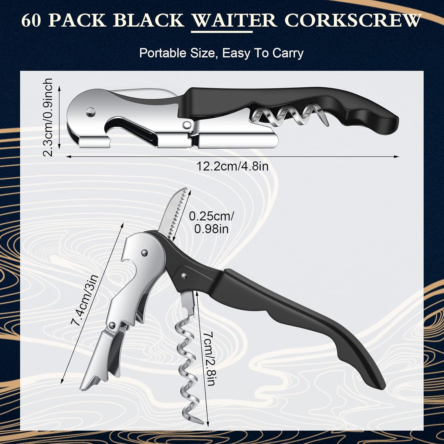- Package Included: you will receive 60 pieces wine key bottle opener in color of black, it is a multifunctional all in one corkscrew that integrates wine corkscrew, beer corkscrew and foil cutter, the sufficient quantity are enough to meet your daily use and replacement needs
