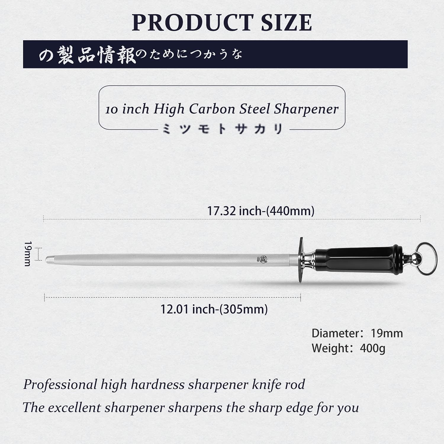 - PROFESSIONAL KNIFE SHARPENER ROD: The kitchen knife sharpener feature a high carbon steel and diamond surface to sharpen dull blades easily and efficiently. Its fine abrasive grains ensure a sharp edge every time, making your cuts easier