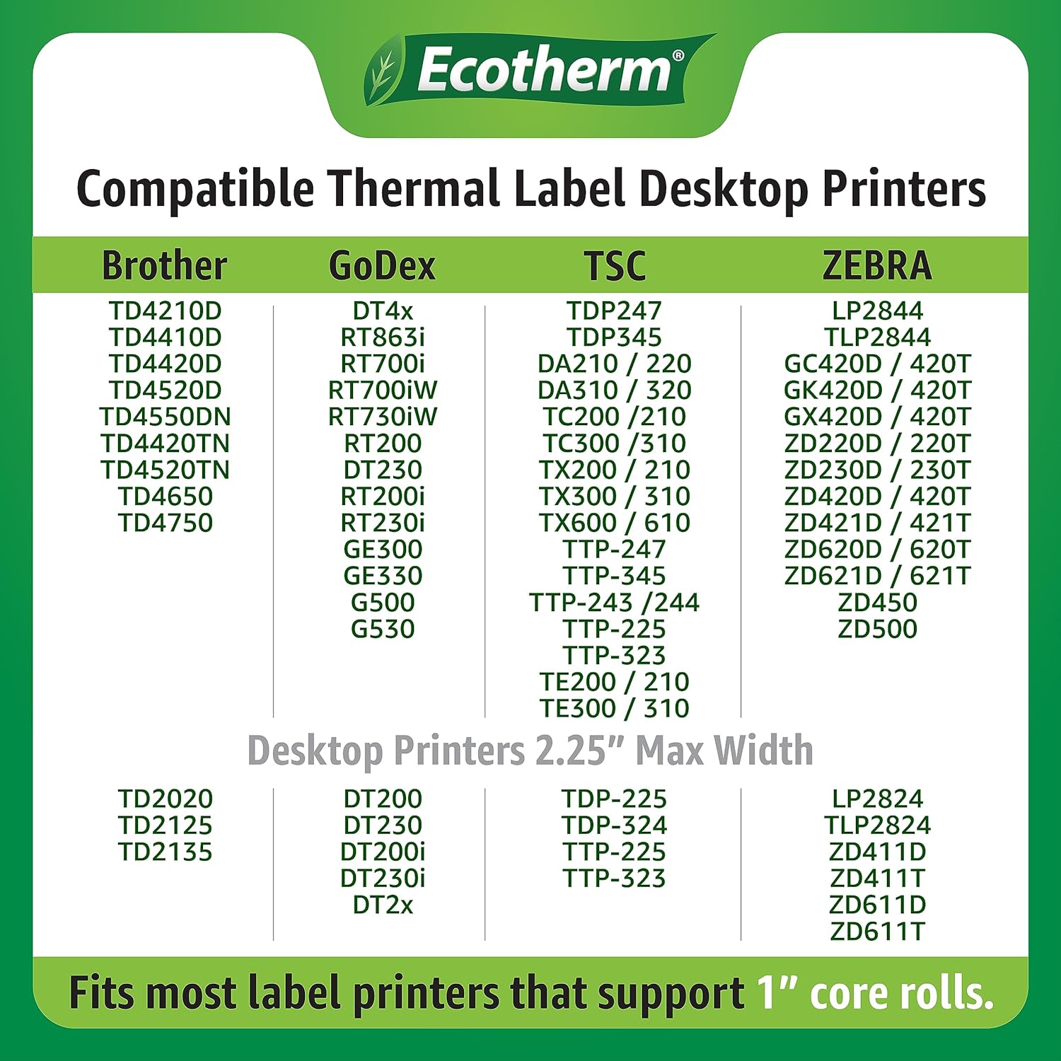 2.25" x 2.5" Thermal Labels | 4 Rolls | 2400 Labels | fits Zebra, Munbyn, Rollo, Godex, Arkscan, iDPRT, Offnova Thermal Label Printers and More | Blank White Adhesive Stickers by Ecotherm